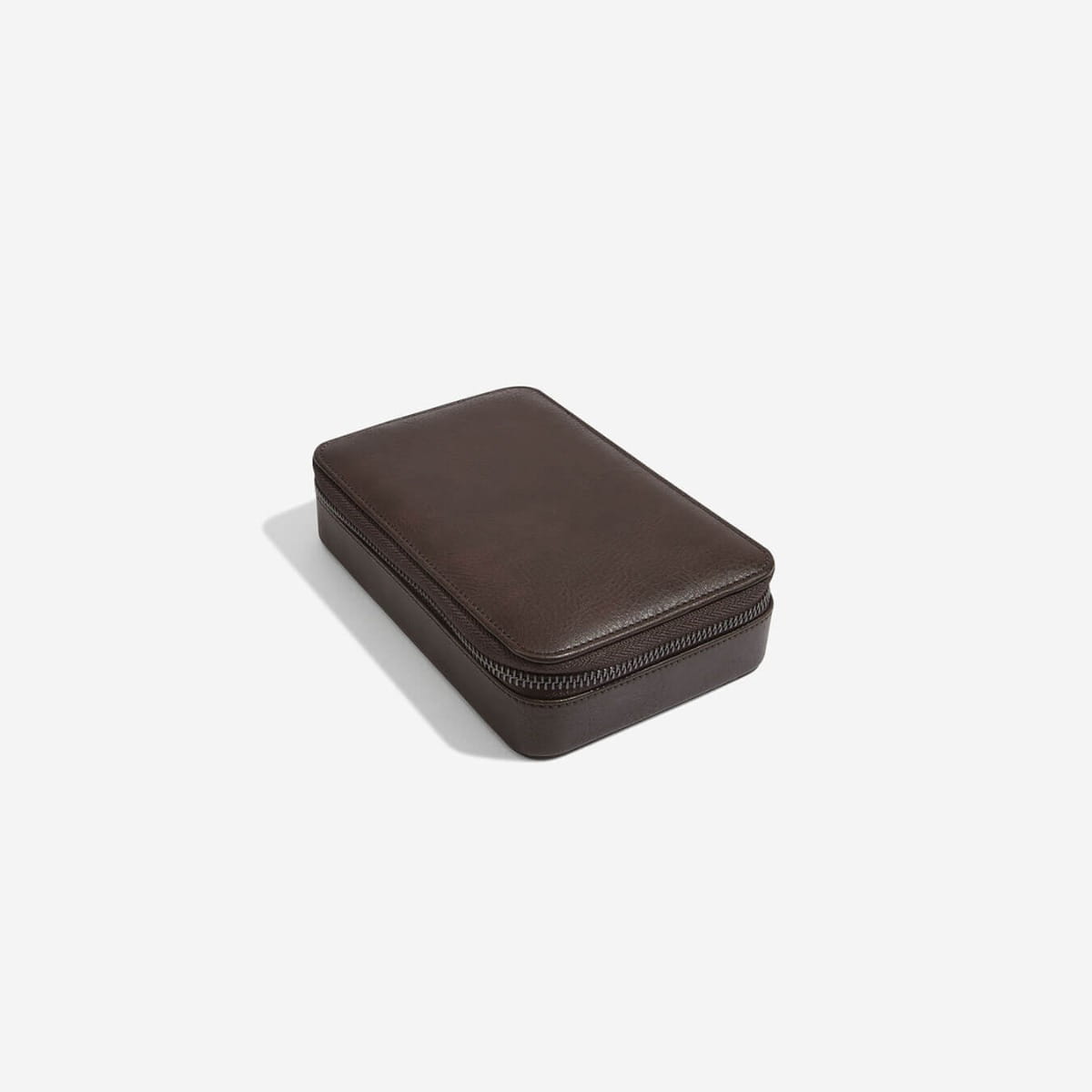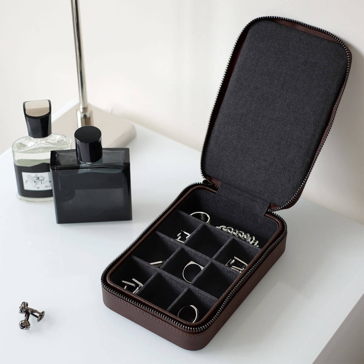 Męskie pudełko na spinki Stackers jest zapinane na zamek błyskawiczny i posiada 9 małych przegródek na spinki do mankietów i inne mniejsze akcesoria oraz większą część z tyłu. Zewnętrzna część wykonana jest z ekologicznej skóry, a podszewka z bawełny.