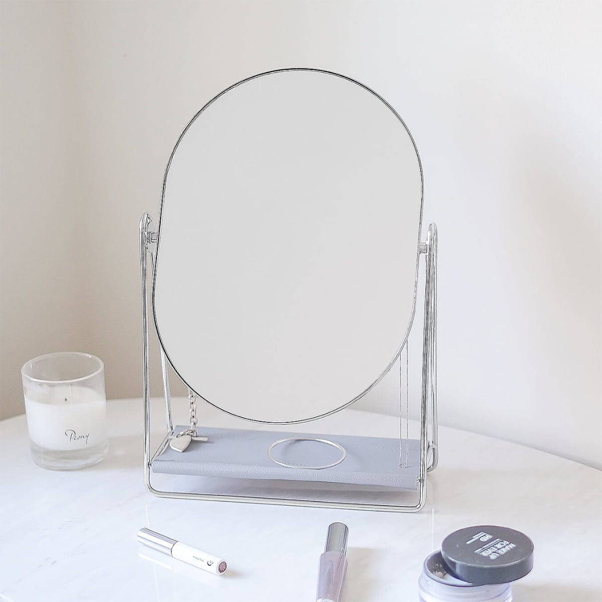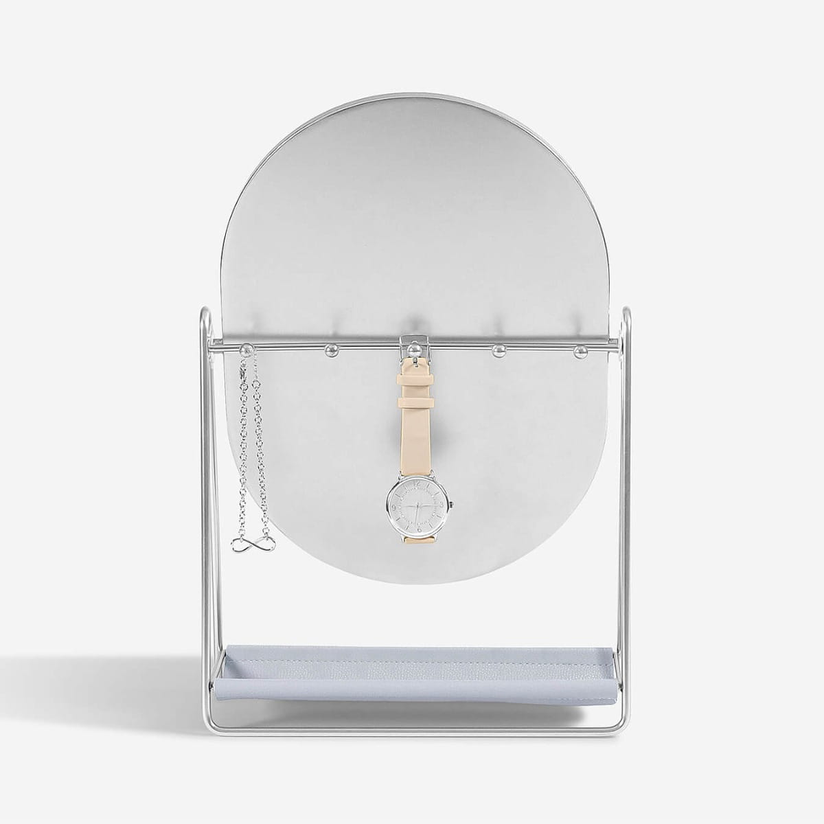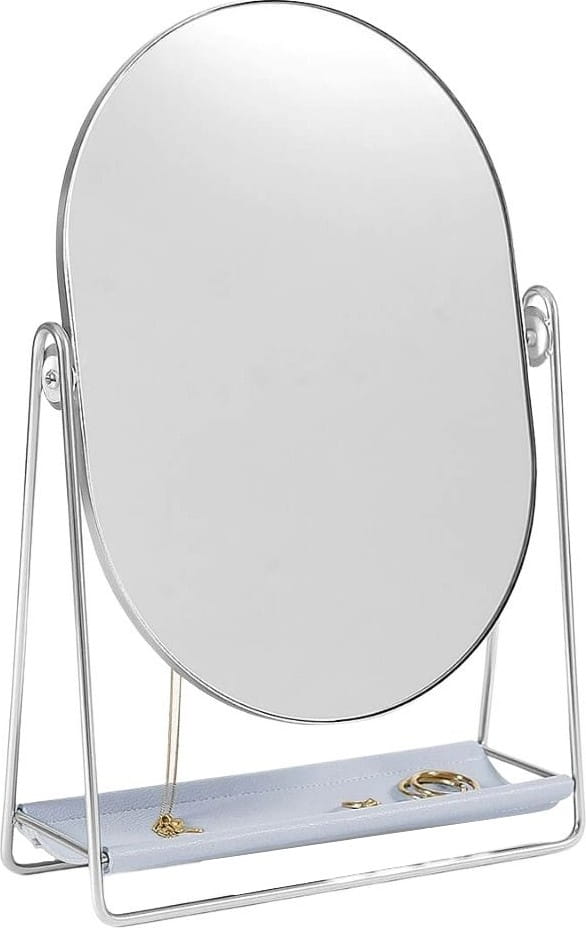 Lusterko z organizerem na biżuterię to piękne wykończenie każdej toaletki. Z przodu znajduje się duże lustro, osadzone na metalowej ramie, dzięki której można je przechylać pod dowolnym kątem. Na odwrocie znajdują się ukryte haczyki na biżuterię, dzięki którym biżuteria będzie w zasięgu ręki, a jednocześnie w idealnym porządku. Poręczna podstawa z ekologicznej skóry zapewnia dodatkowe miejsce na akcesoria do włosów i inne drobiazgi.