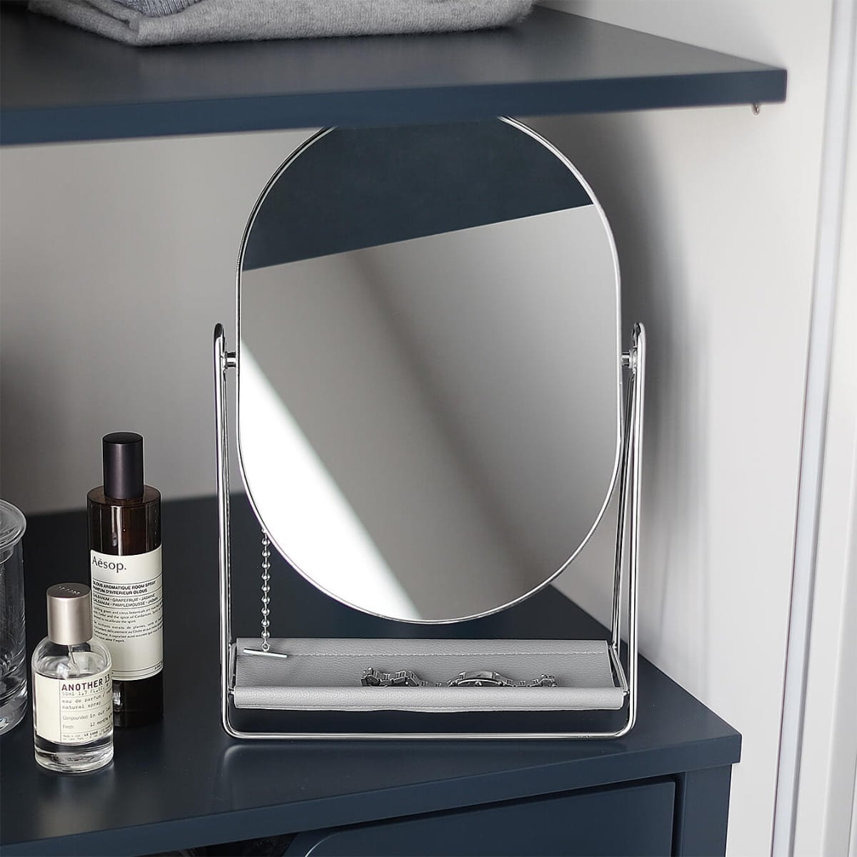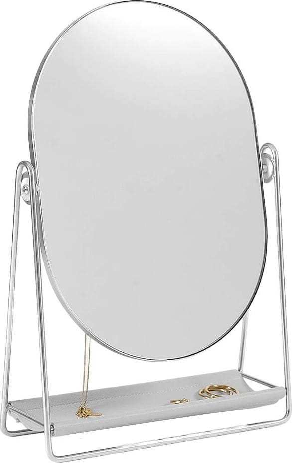 Lusterko z organizerem na biżuterię to piękne wykończenie każdej toaletki. Z przodu znajduje się duże lustro, osadzone na metalowej ramie, dzięki której można je przechylać pod dowolnym kątem. Na odwrocie znajdują się ukryte haczyki na biżuterię, dzięki którym biżuteria będzie w zasięgu ręki, a jednocześnie w idealnym porządku. Poręczna podstawa z ekologicznej skóry zapewnia dodatkowe miejsce na akcesoria do włosów i inne drobiazgi.
