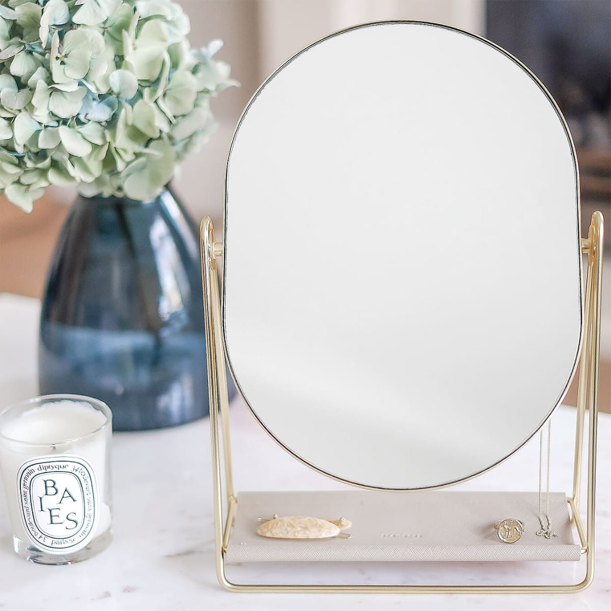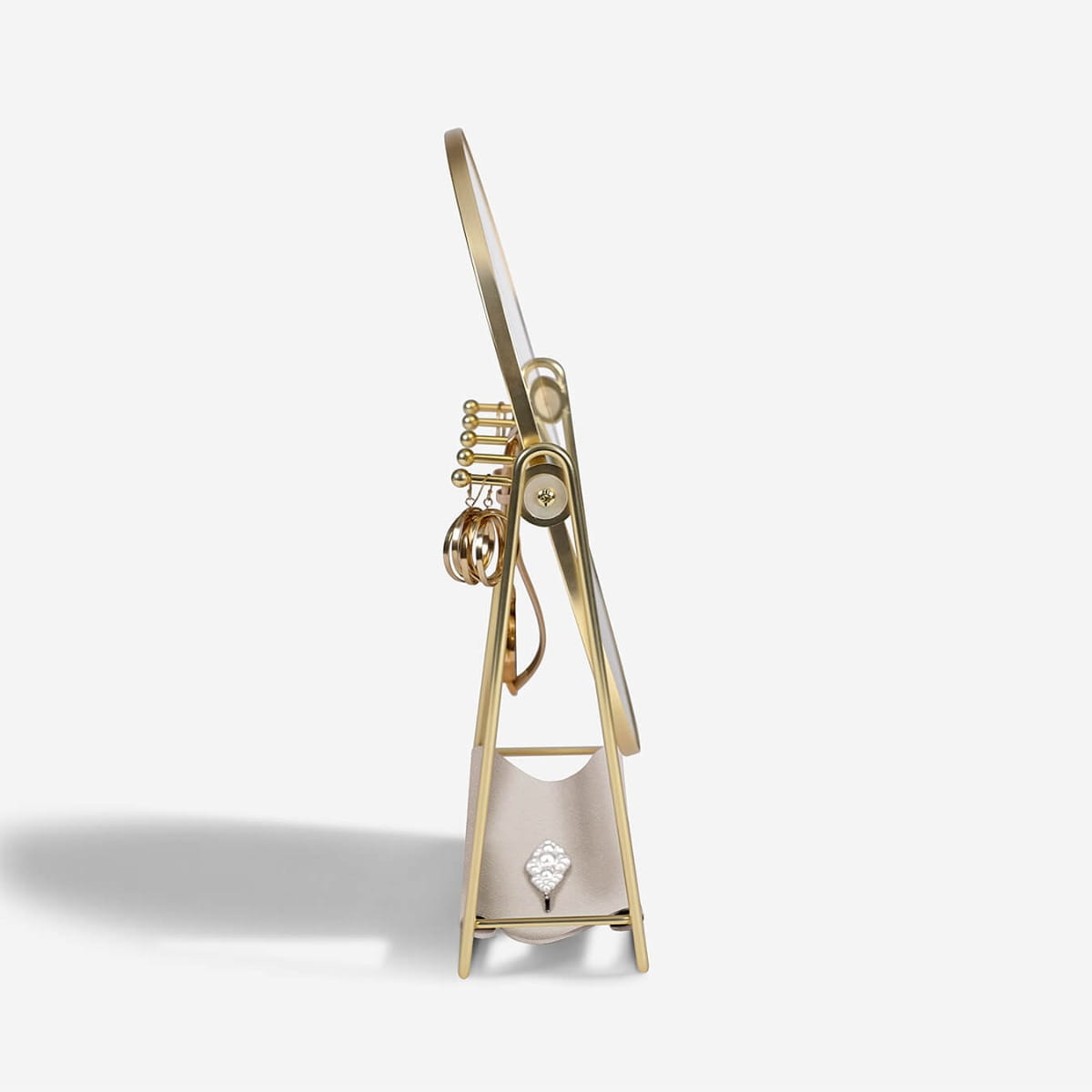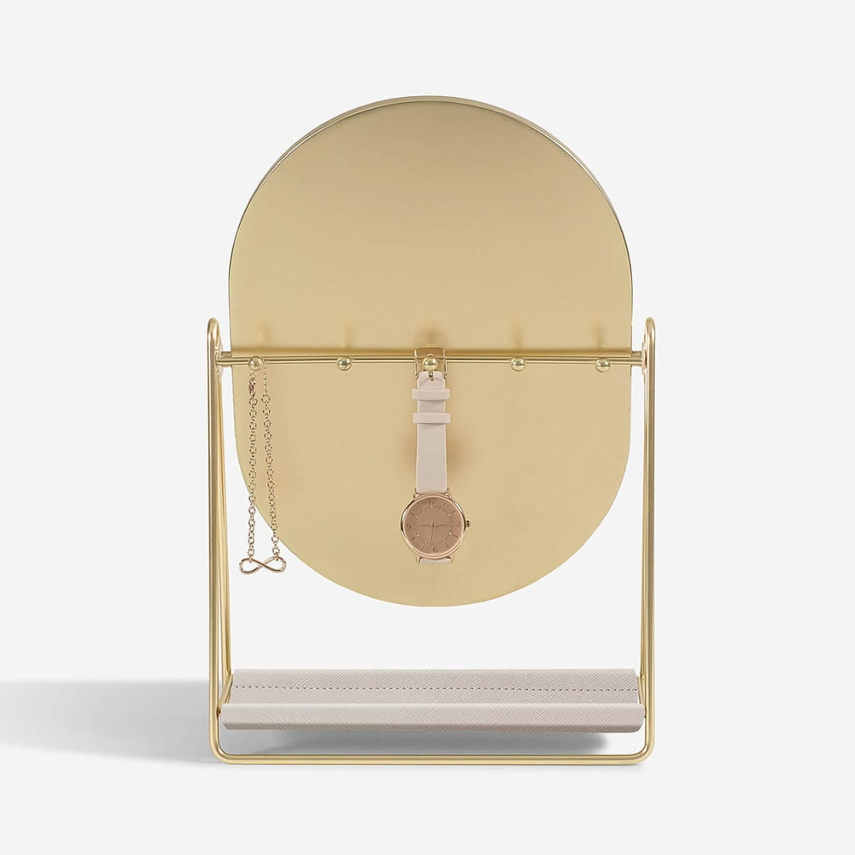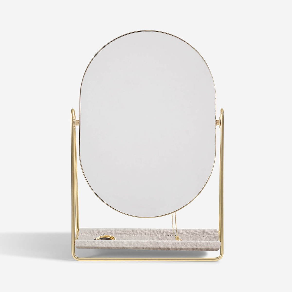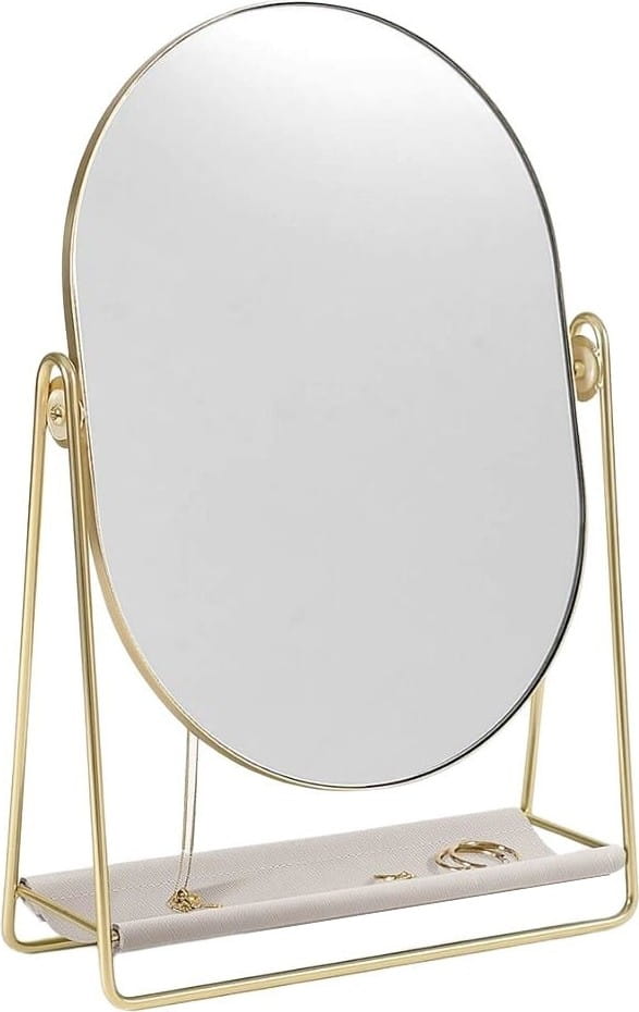 Lusterko z organizerem na biżuterię to piękne wykończenie każdej toaletki. Z przodu znajduje się duże lustro, osadzone na metalowej ramie, dzięki której można je przechylać pod dowolnym kątem. Na odwrocie znajdują się ukryte haczyki na biżuterię, dzięki którym biżuteria będzie w zasięgu ręki, a jednocześnie w idealnym porządku. Poręczna podstawa z ekologicznej skóry zapewnia dodatkowe miejsce na akcesoria do włosów i inne drobiazgi.