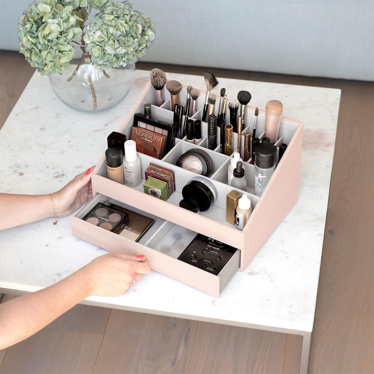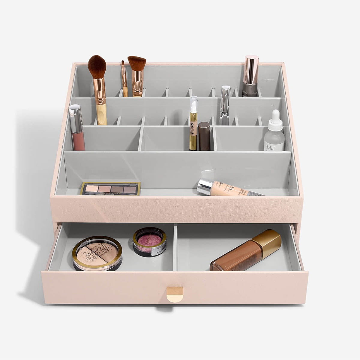 Szukasz miejsca do przechowywania kosmetyków, aby uporządkować swoją stale powiększającą się kolekcję. Organizer na kosmetyki Stackers open classic z szufladą posiada na górze otwarty pojemnik z wieloma przegródkami, które pomieszczą wszystkie codzienne kosmetyki, od pędzli, przez podkład, po szminki. Jest również wyposażony w wysuwaną szufladę idealną na większe palety i przybory do makijażu. Wnętrze może być na bieżąco czyszczone, a sam organizer został zaprojektowany tak, aby pasował do szuflady na kosmetyki, umożliwiając dodanie dodatkowych poziomów. Może być używany z warstwami w rozmiarze Classic lub jako samodzielny element.