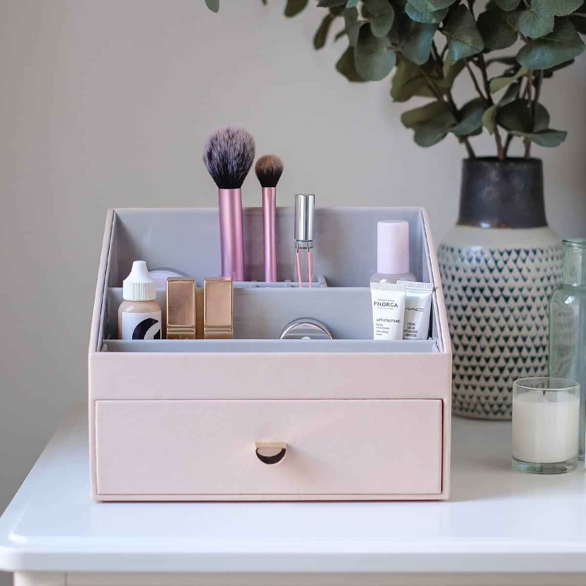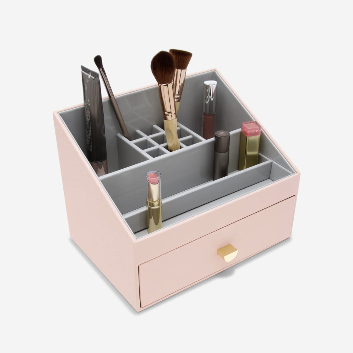 Szukasz pojemnika, który pozwoli Ci uporządkować Twoją stale powiększającą się kolekcję kosmetyków do makijażu? Przedstawiamy organizer na kosmetyki do makijażu Stackers. Na górze znajduje się otwarty pojemnik z wieloma przegródkami, które pomieszczą wszystkie Twoje produkty do codziennego makijażu, od pędzli, przez podkład, po szminki. Wewnątrz znajduje się wysuwana szuflada idealna na większe palety i przybory. Podszewkę można łatwo wyczyścić. Organizer został zaprojektowany tak, aby pasował do szuflady na kosmetyki, umożliwiając dodanie dodatkowych szuflad, gdy Twoja kolekcja się powiększy. Można go używać z klasyczną szkatułką na biżuterię, aby stworzyć organizer na toaletkę, lub używać samodzielnie, aby uporządkować niezbędne rzeczy.