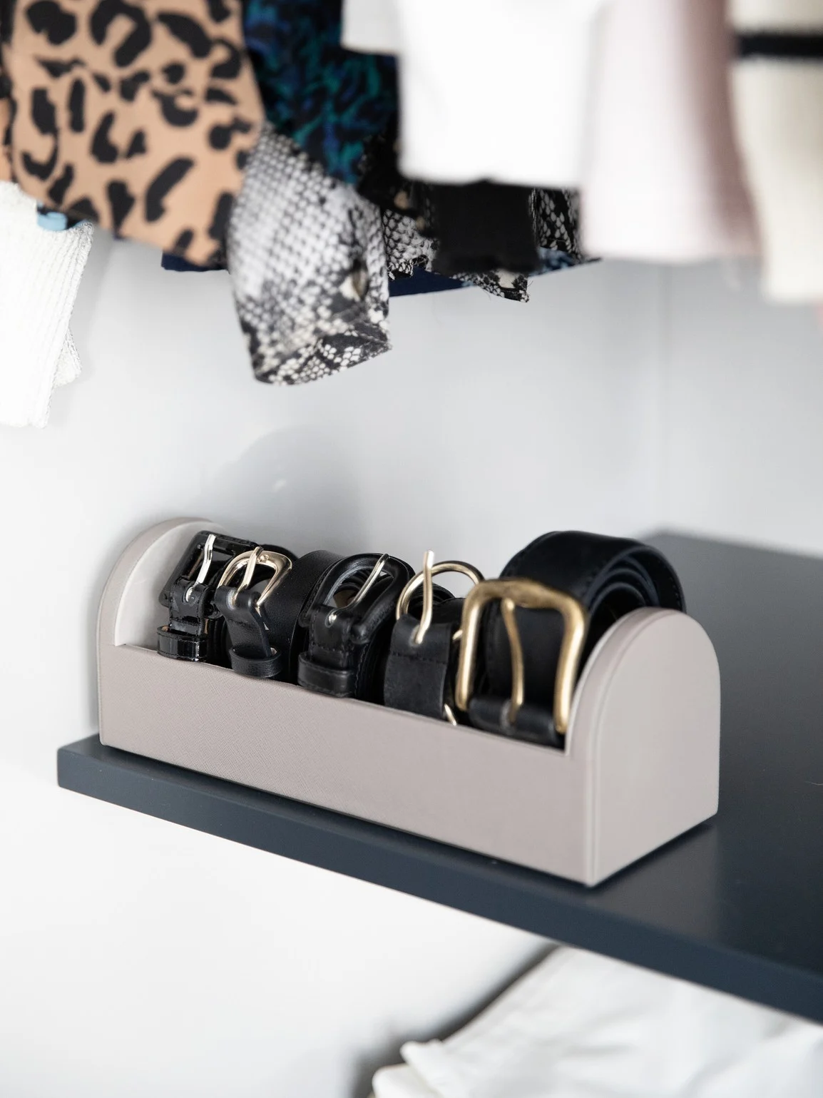 Uporządkuj swoje paski w elegancki sposób dzięki Organizerowi na pasek Stackers. Ten praktyczny dodatek do Twojej garderoby lub szuflad jest idealnym rozwiązaniem na chaos. Wykonany z wysokiej jakości sztucznej skóry, zaprojektowany został z myślą o maksymalnie 5 pasach. Dzięki możliwości ich zwijania i przechowywania w jednym miejscu, zapewnia łatwy dostęp i estetyczny porządek.