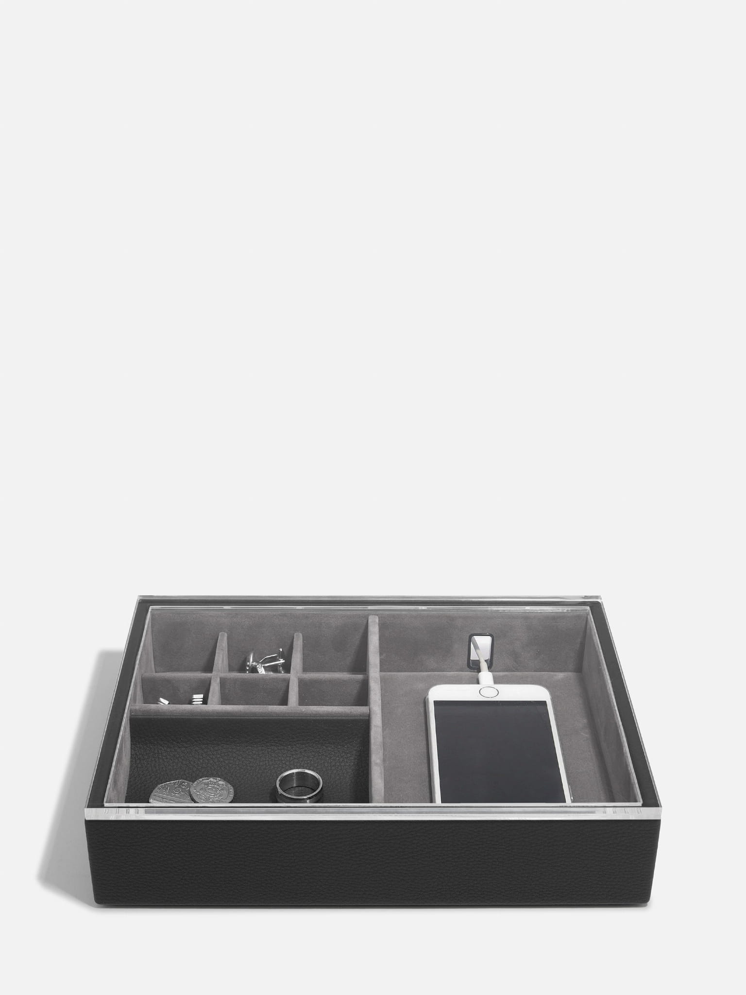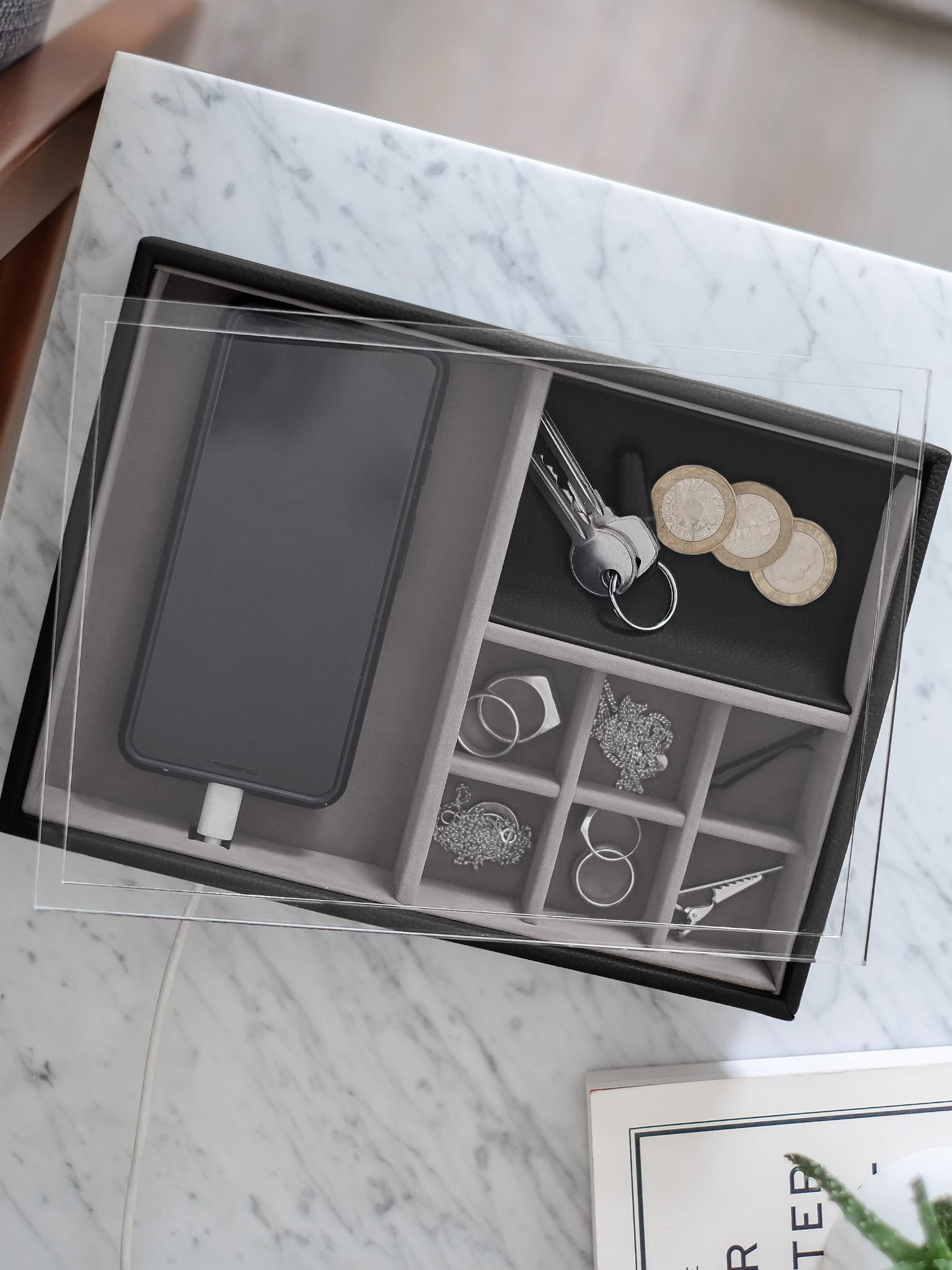 Pudełko na biżuterię, okulary, może służyć jako stacja ładująca do telefonu dzięki specjalnie przygotowanemu wycięciu pozwalającemu wprowadzić kabel do ładowania. Pudełko posiada akrylową osłonę, która chroni zawartość przed kurzem.