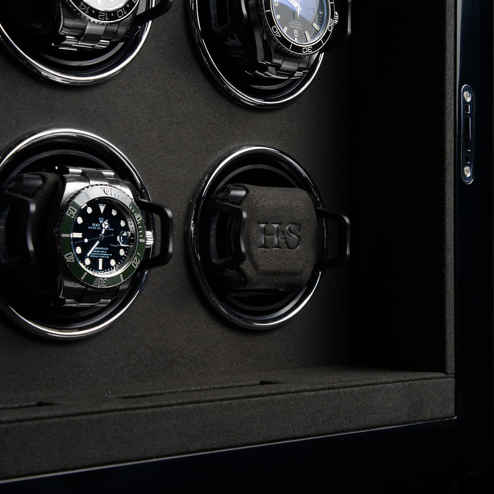 Wnętrze rotomatu wykończone jest miękkim welurem, a elastyczne uchwyty H&S High-Flex dopasowują się do nadgarstków o obwodzie od 14 do 22,5 cm, gwarantując bezpieczne i delikatne utrzymanie każdego zegarka. Stabilność podczas pracy zapewniają zatrzaski kulowe ze stali nierdzewnej.