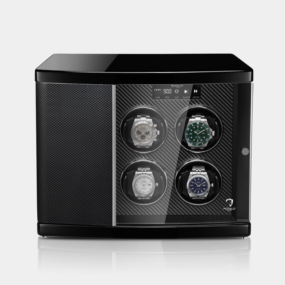 TIMELESS MV4 łączy w sobie wszystkie życzenia miłośnika zegarków w mistrzowskiej kompozycji. W nowej generacji prezentuje się w litym drewnie nowozelandzkim i nowych kombinacjach kolorystycznych, takich jak czarny wzór drewna Makassar. Rotomat dla 4 zegarków z dodatkowymi 2 miejscami na zegarki kwarcowe.