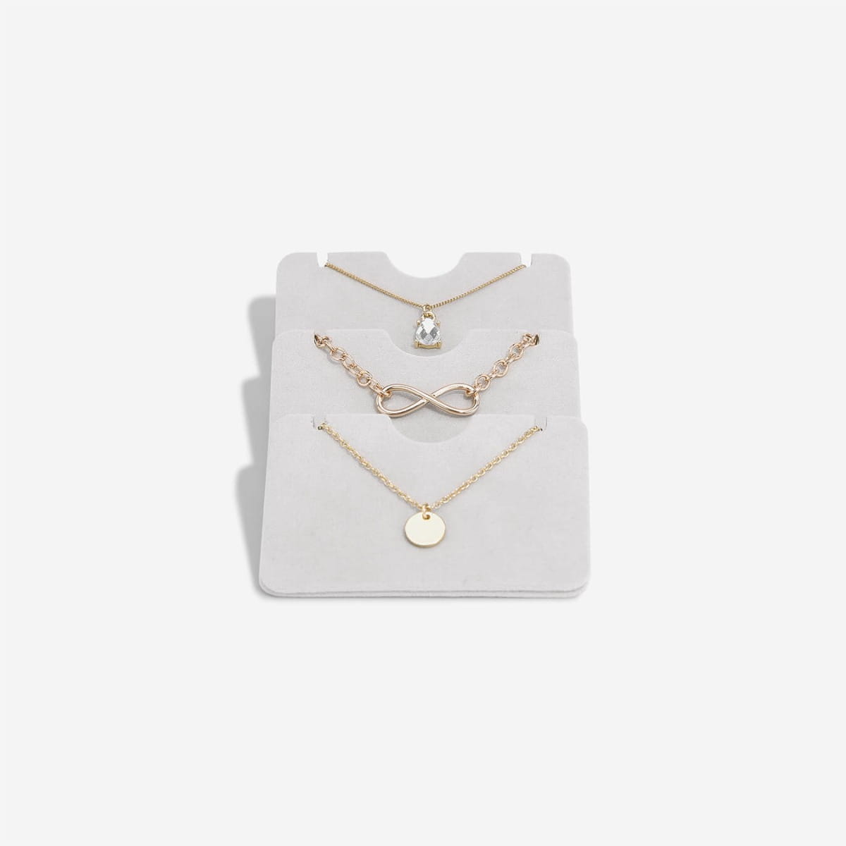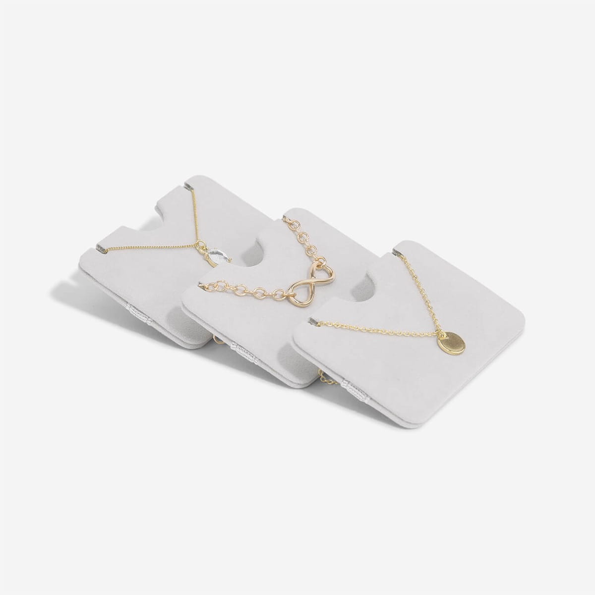 Spraw,aby Twoje naszyjniki dumnie prezentowały się na swoich miejscah dzięki stojakom na naszyjniki Stackers. Pięknie zaprojektowane, opierają się na okrągłej podstawce, z elastyczną gumką z tyłu zabezpieczającą przed plątaniem się. Zestaw zawiera 3 sztuki.