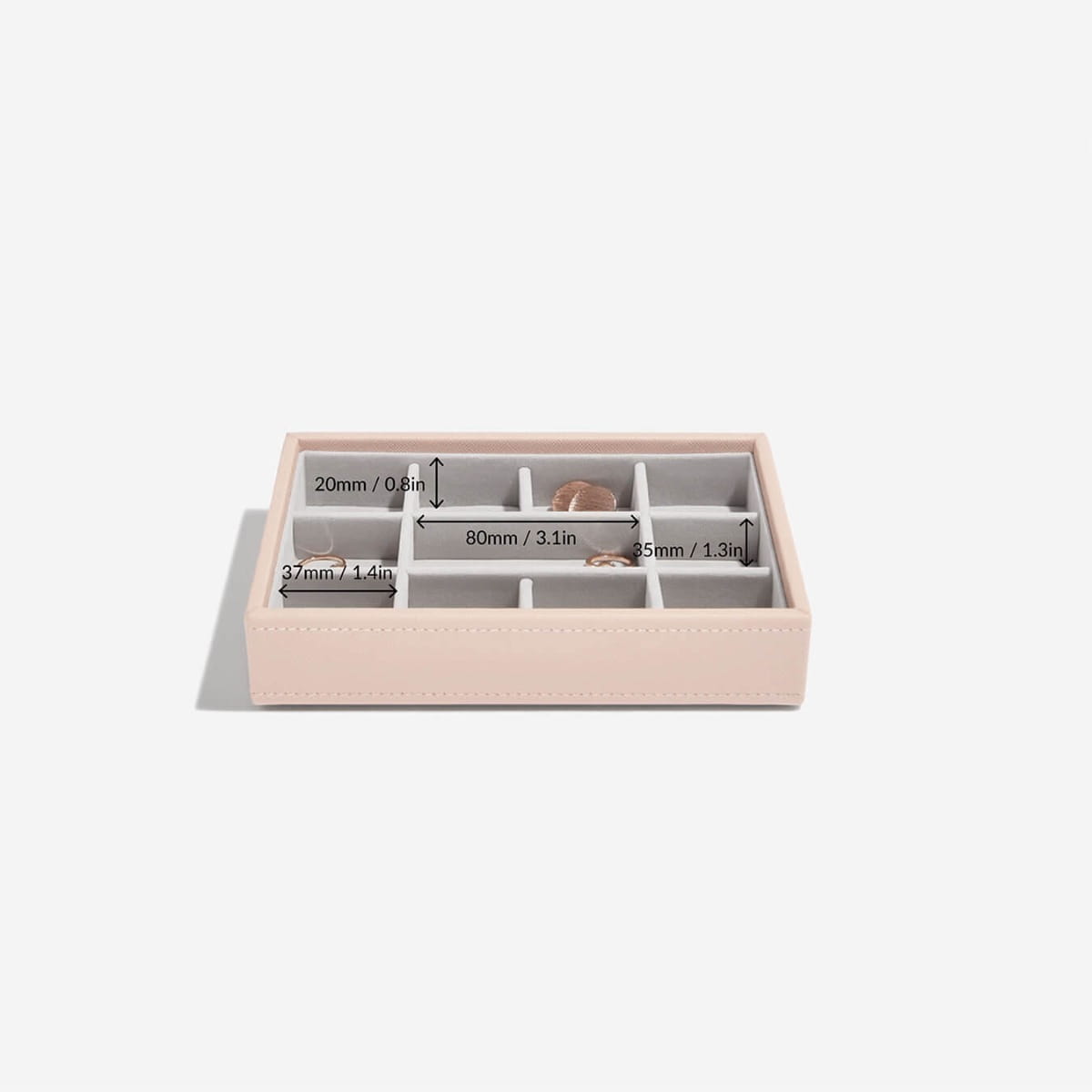 Pudełka na biżuterię Stackers zostały zaprojektowane tak, aby możliwe było stworzenie swojej własnej kombinacji, wybierając warstwy i akcesoria najlepiej pasujące do Twojej kolekcji biżuterii. Warstwa na drobne drobiazgi jest idealna na wszystkie kolczyki, pierścionki i charmsy. Dzięki 11 oddzielnym komorom jest to idealny produkt pozwalający uporządkować drobne elementy biżuterii. Dobra rada: aby Twoje cienkie łańcuszki nie plątały się, wystarczy umieścić każdy z nich w oddzielnej komorze.