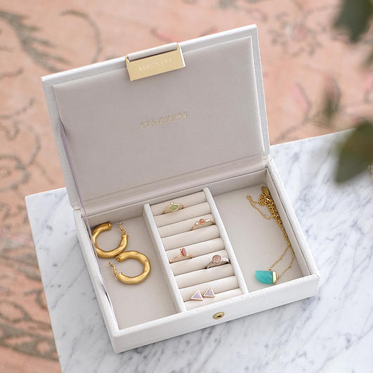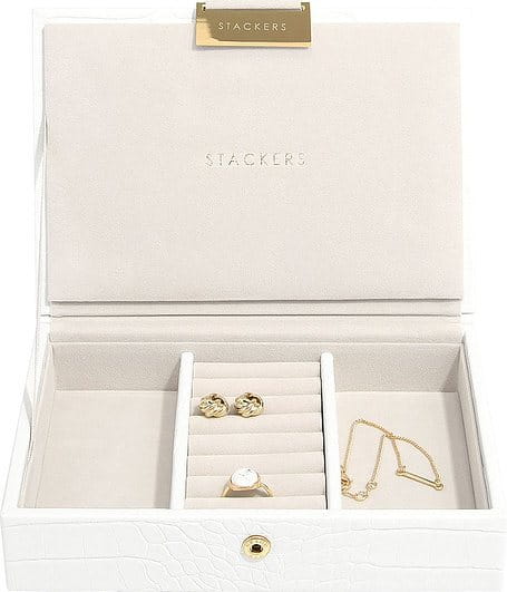 Szkatułka na biżuterię Stackers Croc mini z pokrywką jest idealnym miejscem na pierścionki, kolczyki i naszyjniki. Twoja stale powiększająca się kolekcja biżuterii będzie zawsze uporządkowana i wolna od plątaniny. Pudełko ma idealny rozmiar dla codziennej biżuterii i dla osób, które dopiero rozpoczynają swoją przygodę z kolekcjonowaniem cennych dodatków. Szkatułka może służyć jako samodzielny element, a gdy kolekcja się powiększy, możesz po prostu dodać kolejną warstwę.