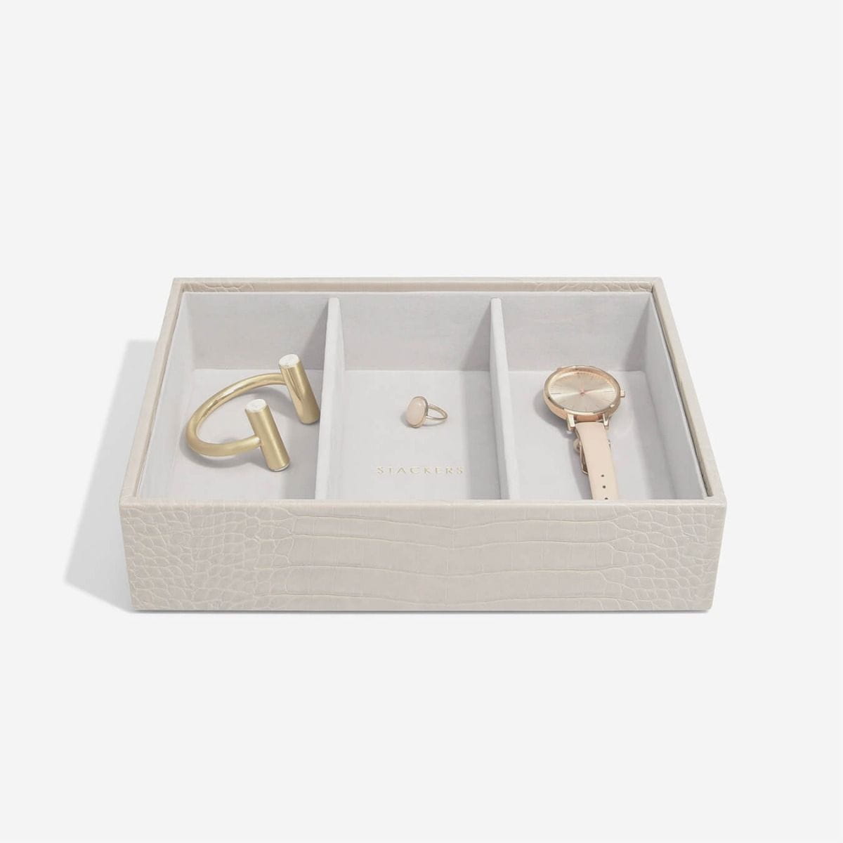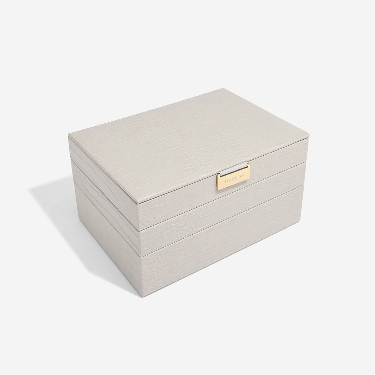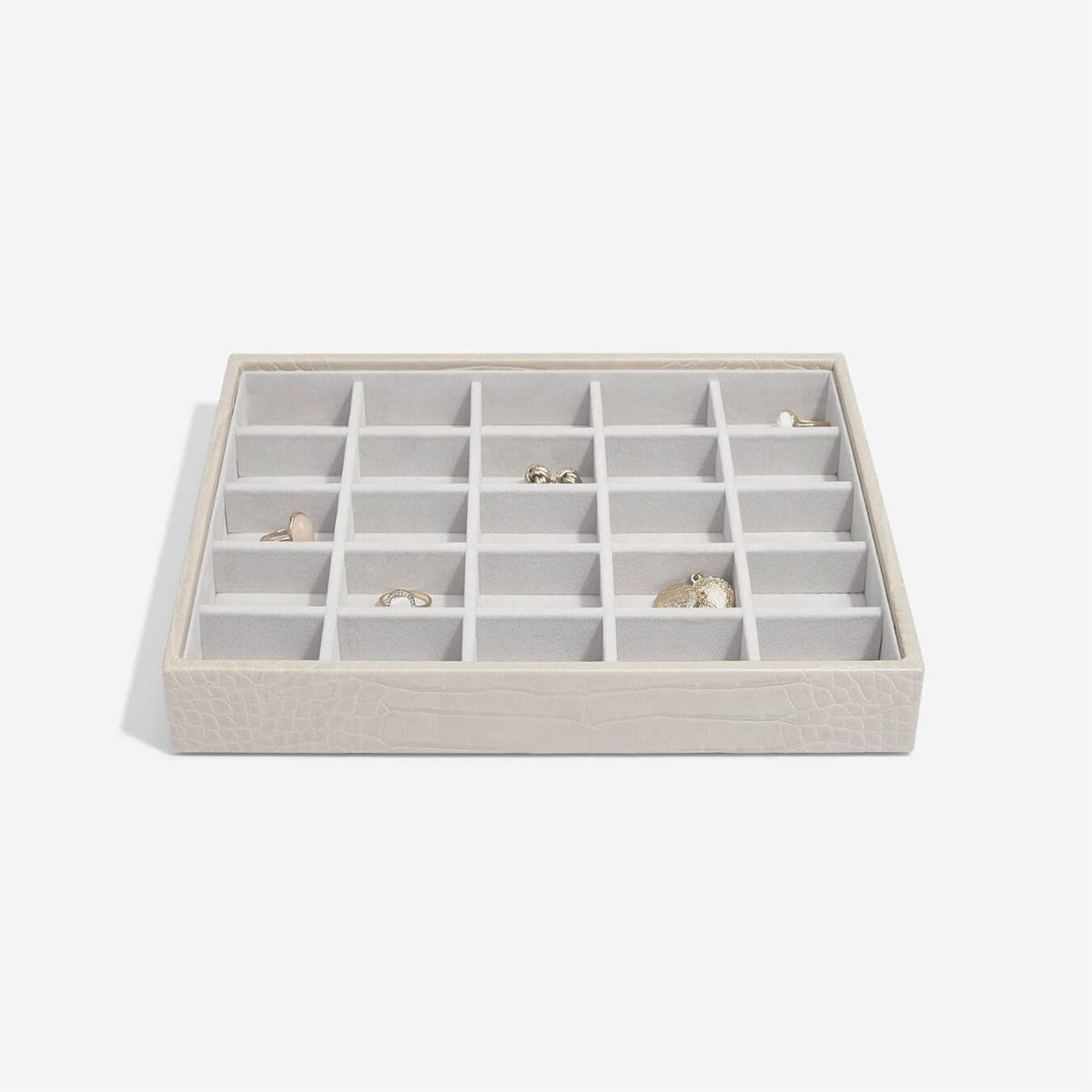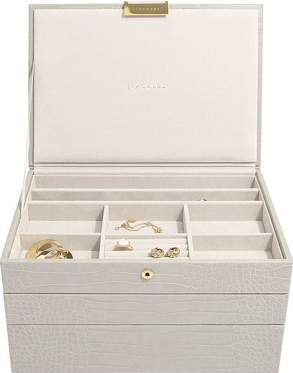 Nie będzie już wymówki, dla braku organizacji Twojej biżuterii! Nasza bestsellerowa potrójna szkatułka w rozmiarze Classic jest idealna dla prawie każdej kolekcji biżuterii. Dzięki dużej ilości miejsca można w niej przechowywać naszyjniki, pierścionki, kolczyki, zegarki i wiele innych elementów, które są pięknie uporządkowane i bezpieczne. Co więcej, w miarę powiększania się kolekcji można łatwo dodać kolejne pudełka Zestaw jest idealnym punktem wyjścia i zawiera pokrywę pudełka na biżuterię, warstwę na drobiazgi oraz warstwę na zegarki lub dodatki. Pamiętaj, że możesz jeszcze bardziej dostosować swoją szkatułkę na biżuterię dzięki kolejnym warstwom i akcesoriom.
