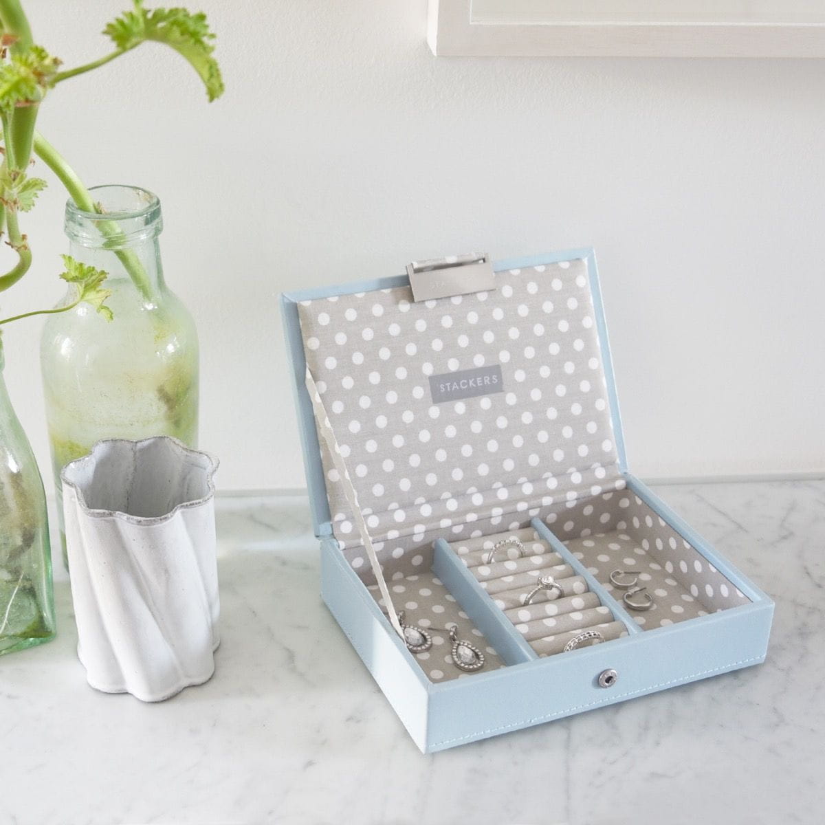 Pokrywka szkatułki na biżuterię to idealne miejsce do przechowywania pierścionków, kolczyków i naszyjników. Twoja stale powiększająca się kolekcja biżuterii będzie zawsze uporządkowana Szkatułka w rozmiarze Mini z przykrywką jest idealna do przechowywania codziennej biżuterii i dla osób, które dopiero rozpoczynają swoją przygodę z kolekcjonowaniem biżuterii. Może służyć jako samodzielna szkatułka, a gdy kolekcja się powiększy, można po prostu dodać kolejną warstwę.