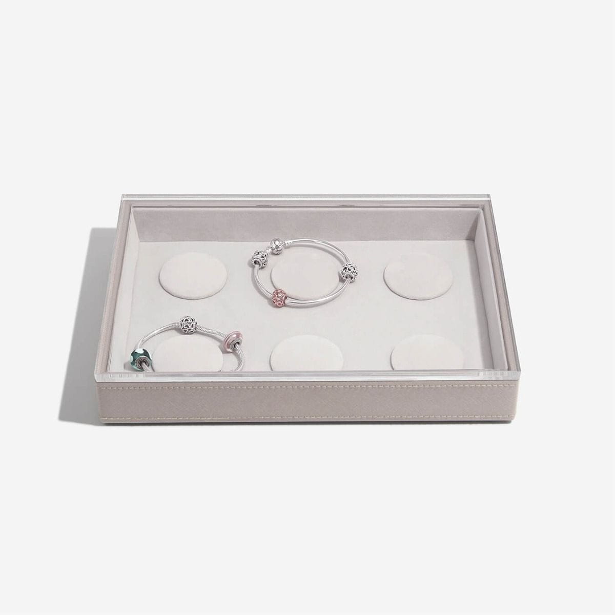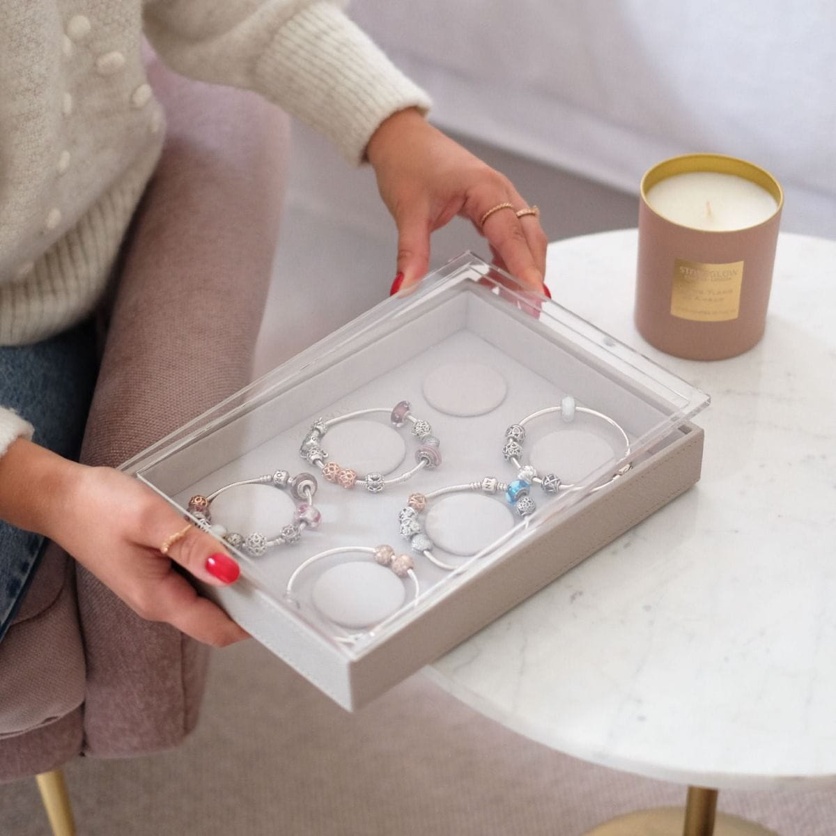Pudełko na biżuterię Stackers zostało zaprojektowane tak, abyś mogła stworzyć swoje własne zestawienie, wybierając warstwy i akcesoria, które najlepiej pasują do Twojej wyjątkowej kolekcji. Szkatułka na bransoletki charms Stackers classic z pokrywką to jest wspaniały dodatek do Twojej kolekcji charmsów. Posiada przezroczystą akrylową pokrywę, aby Twoje koraliki były bezpieczne i widoczne, a także klasyczną warstwę na 6 bransoletek. Zaprojektowane przez kolekcjonerów dla kolekcjonerów charmsów, posiada 6 wkładek do przechowywania gotowych bransoletek, dzięki czemu eksponowanie biżuterii stanie się proste i estetyczne!