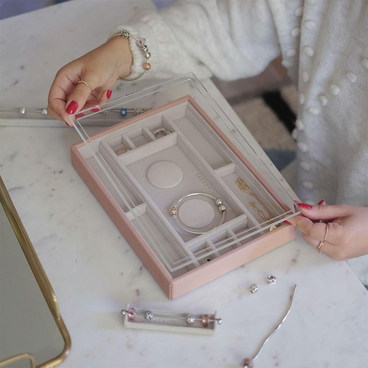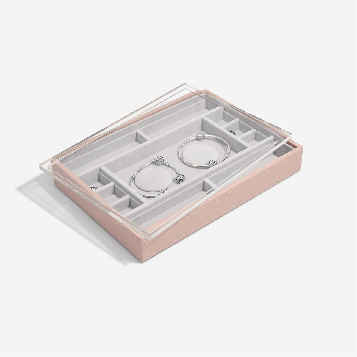 Pudełko na biżuterię Stackers zostało zaprojektowane tak, abyś mogła stworzyć swoje własne zestawienie, wybierając warstwy i akcesoria, które najlepiej pasują do Twojej wyjątkowej kolekcji. Szkatułka na bransoletki charms Stackers classic z pokrywką to jest wspaniały dodatek do Twojej kolekcji charmsów. Posiada przezroczystą akrylową pokrywę, aby Twoje koraliki były bezpieczne i widoczne. Zaprojektowane przez kolekcjonerów dla kolekcjonerów charmsów, posiada 2 wkładki na gotowe bransoletki, jak również wiele przegródek na dodatkowe charmsy. Boczne części zostały stworzone tak, aby pasowały do stojaków! Stwórz miejsce do przechowywania charmsów, które będzie pasowało do Ciebie i Twojej kolekcji!