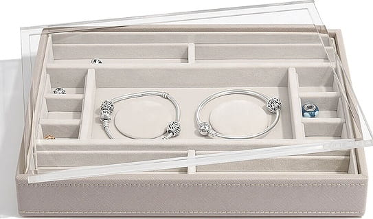 Pudełko na biżuterię Stackers zostało zaprojektowane tak, abyś mogła stworzyć swoje własne zestawienie, wybierając warstwy i akcesoria, które najlepiej pasują do Twojej wyjątkowej kolekcji. Szkatułka na bransoletki charms Stackers classic z pokrywką to jest wspaniały dodatek do Twojej kolekcji charmsów. Posiada przezroczystą akrylową pokrywę, aby Twoje koraliki były bezpieczne i widoczne. Zaprojektowane przez kolekcjonerów dla kolekcjonerów charmsów, posiada 2 wkładki na gotowe bransoletki, jak również wiele przegródek na dodatkowe charmsy. Boczne części zostały stworzone tak, aby pasowały do stojaków! Stwórz miejsce do przechowywania charmsów, które będzie pasowało do Ciebie i Twojej kolekcji!