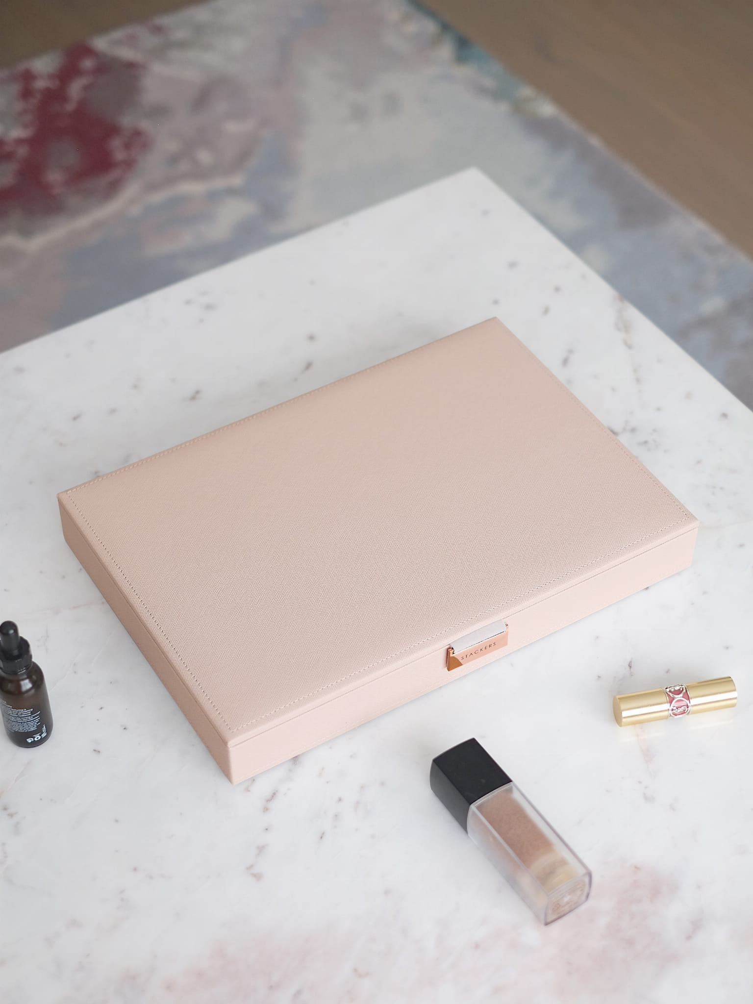 Duża szkatułka na biżuterię to idealny początek pudełka na biżuterię lub jako samodzielny element. Wyposażony w rolkę na pierścionki, idealną na kolczyki lub pierścionki, oraz wiele przegródek na dodatkowe pierścionki, kolczyki, naszyjniki i bransoletki, dzięki którym Twoja biżuteria będzie pięknie zorganizowana!