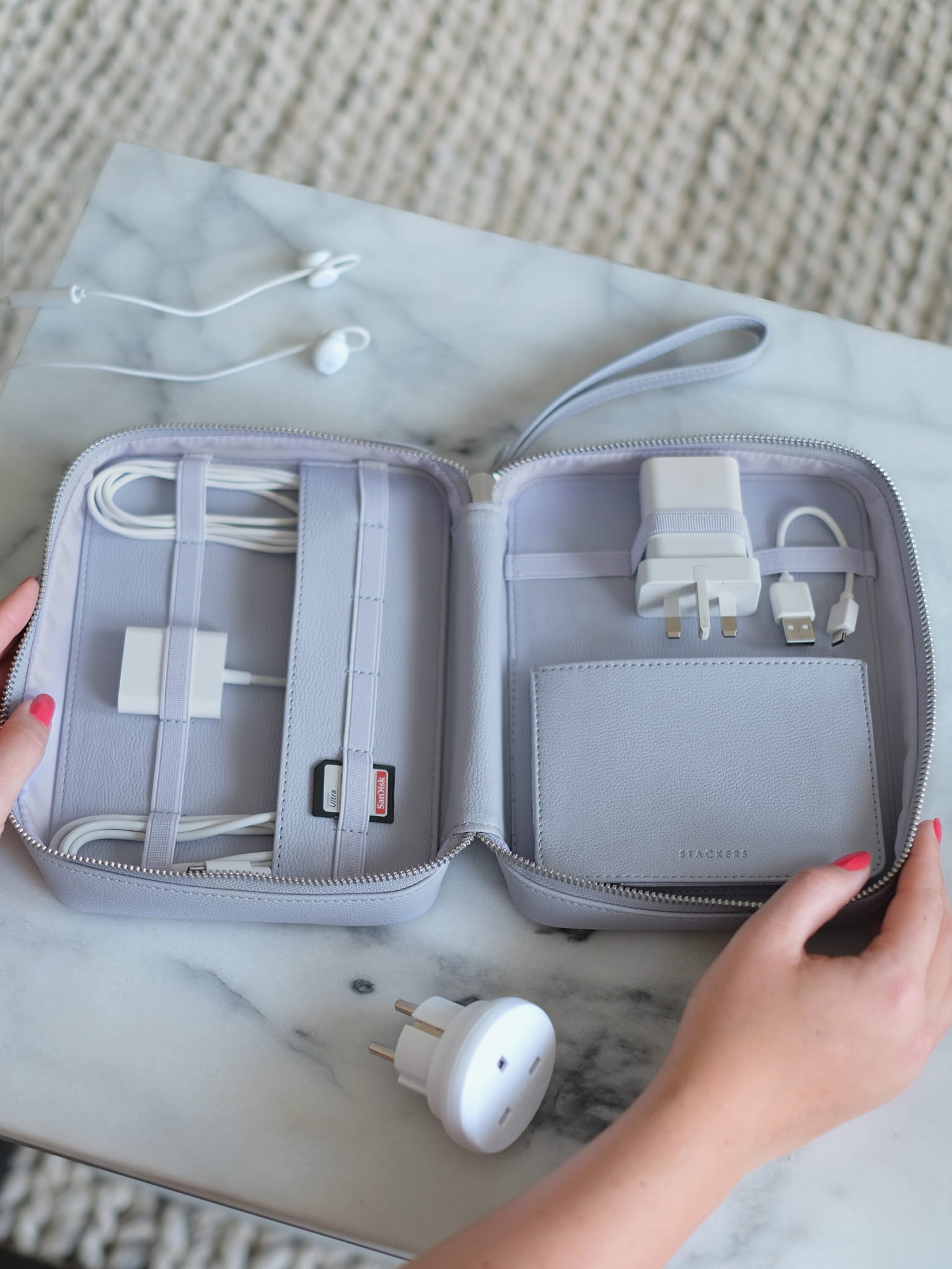Kto by pomyślał, że uporządkowanie kabli może wyglądać tak elegancko? Pojemnik na kable Stackers pomaga utrzymać piękny porządek zarówno podczas podróży, jak i w domu. Wyposażony w liczne wewnętrzne przegródki, jest idealny do przechowywania kabli, kart pamięci, ładowarek i innych akcesoriów.