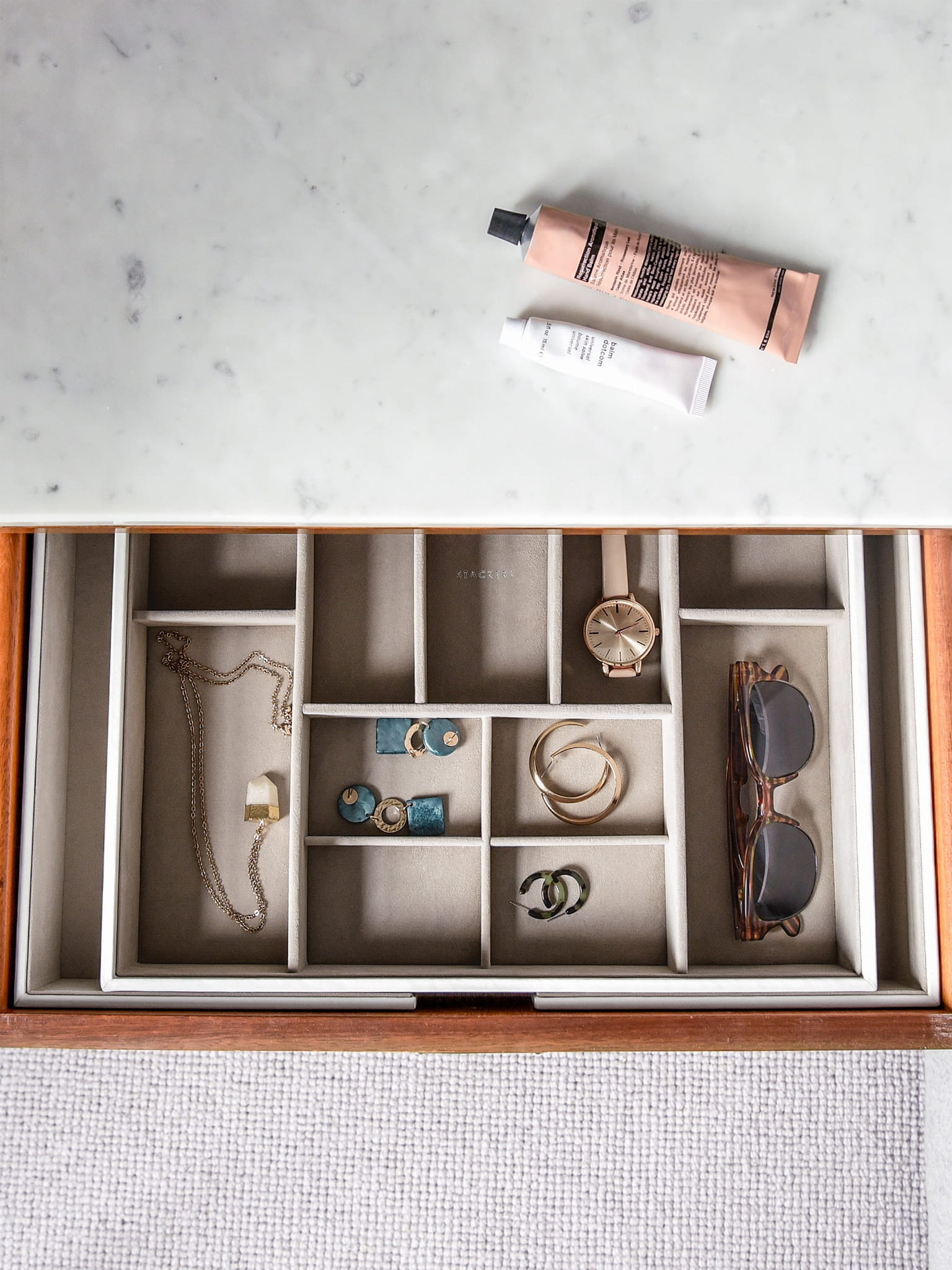 Duża szuflada na biżuterię jest wystarczająco głęboka, aby pomieścić większe elementy biżuterii, a mniejsze przegródki idealnie nadają się na kolczyki i pierścionki. Zaprojektowany tak, aby idealnie pasował do szuflady, suwak rozszerza się, dzięki czemu idealnie pasuje do Twojej przestrzeni. Z miękką aksamitną wyściółką i wieloma przegródkami, które pozwolą Ci pięknie uporządkować akcesoria i biżuterię. Po rozłożeniu większe przegródki z łatwością pomieszczą większe akcesoria, akcesoria do włosów lub okulary przeciwsłoneczne.
