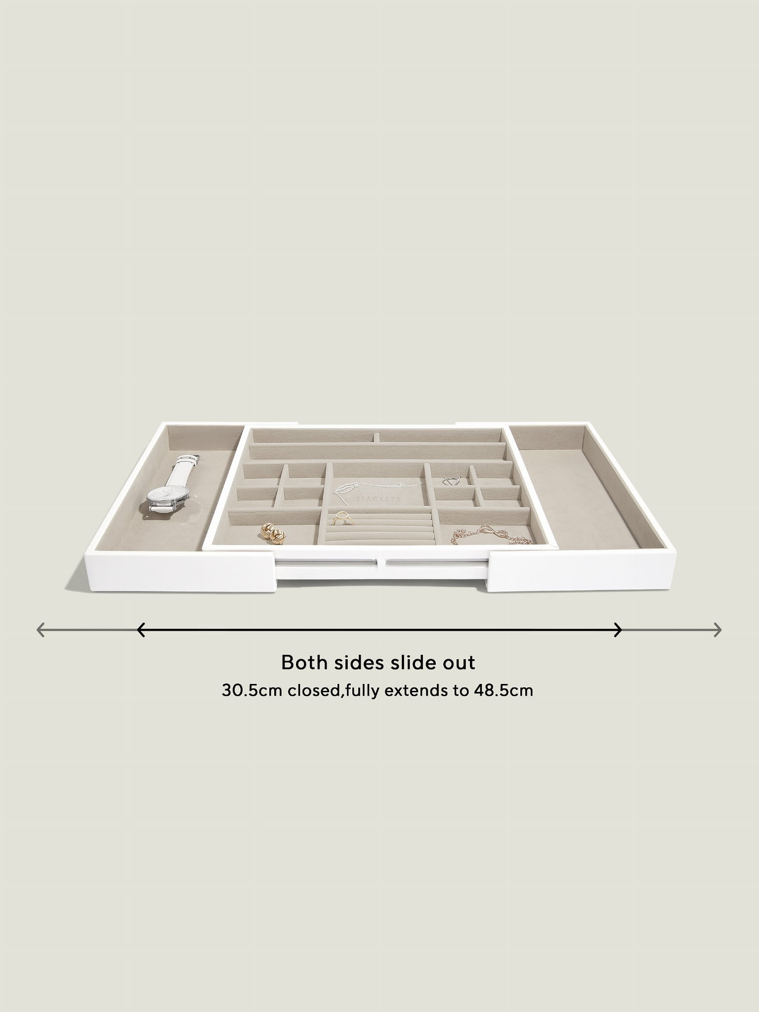 Jeśli chcesz dyskretnie uporządkować swoją biżuterię, suwak do biżuterii może być właśnie tym, czego szukasz. Zaprojektowany tak, aby idealnie pasował do szuflady, suwak rozszerza się, dzięki czemu idealnie pasuje do Twojej przestrzeni. Z miękką aksamitną wyściółką i wieloma przegródkami, które pozwolą Ci bezpiecznie przechowywać pierścionki, bransoletki, naszyjniki i kolczyki. Po rozłożeniu większe przegródki z łatwością pomieszczą większe akcesoria, akcesoria do włosów lub okulary przeciwsłoneczne.