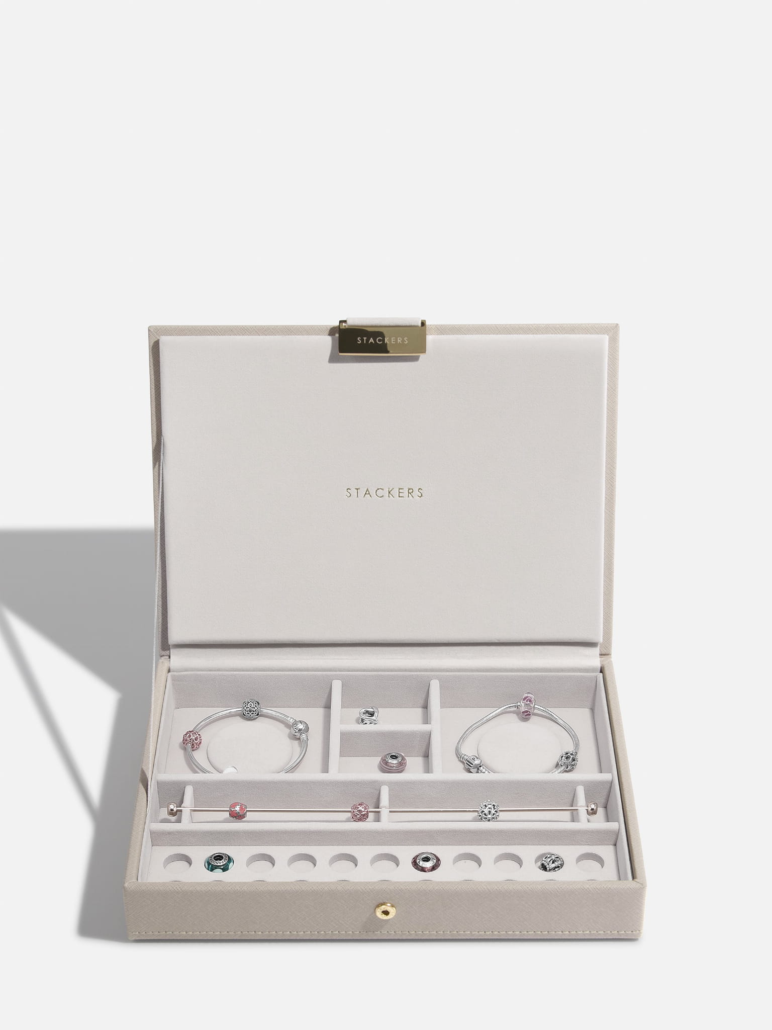 Pudełko na charmsy Stackers zostało zaprojektowane w taki sposób, aby móc stworzyć swoją własną kombinację, wybierając warstwy i akcesoria, które najlepiej pasują do Twojej kolekcji. Pudełko jest doskonałym punktem wyjścia dla każdego kolekcjonera charmsów. Użyj go jako samodzielnego pudełka na biżuterię lub dodaj do niego kolejne warstwy w rozmiarze Classic, aby stworzyć wyjątkową szkatułkę na całą kolekcję. Pudełko posiada dwie komory na bransoletki, długi stojak na charmsy oraz dodatkowe miejsce do przechowywania wszystkich zdób.Twoje dodatkowe charmsy są bezpieczne i pięknie zorganizowane!