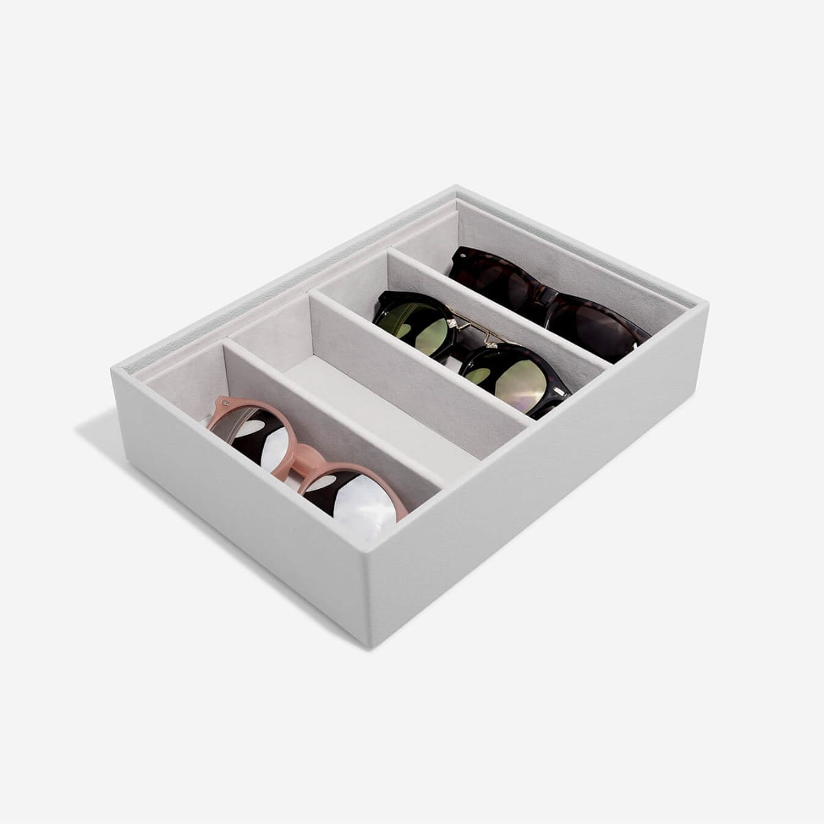 Warstwa do przechowywania okularów i akcesoriów jest idealna do organizacji okularów przeciwsłonecznych i dużych akcesoriów w czterech sekcjach. Wyposażona w wyjmowane przegrody, które umożliwiają dostosowanie rozmiaru sekcji według potrzeb. Można ją dodać do pudełka na biżuterię Stackers lub używać jako samodzielne miejsce do przechowywania na komodzie lub w szufladzie.
