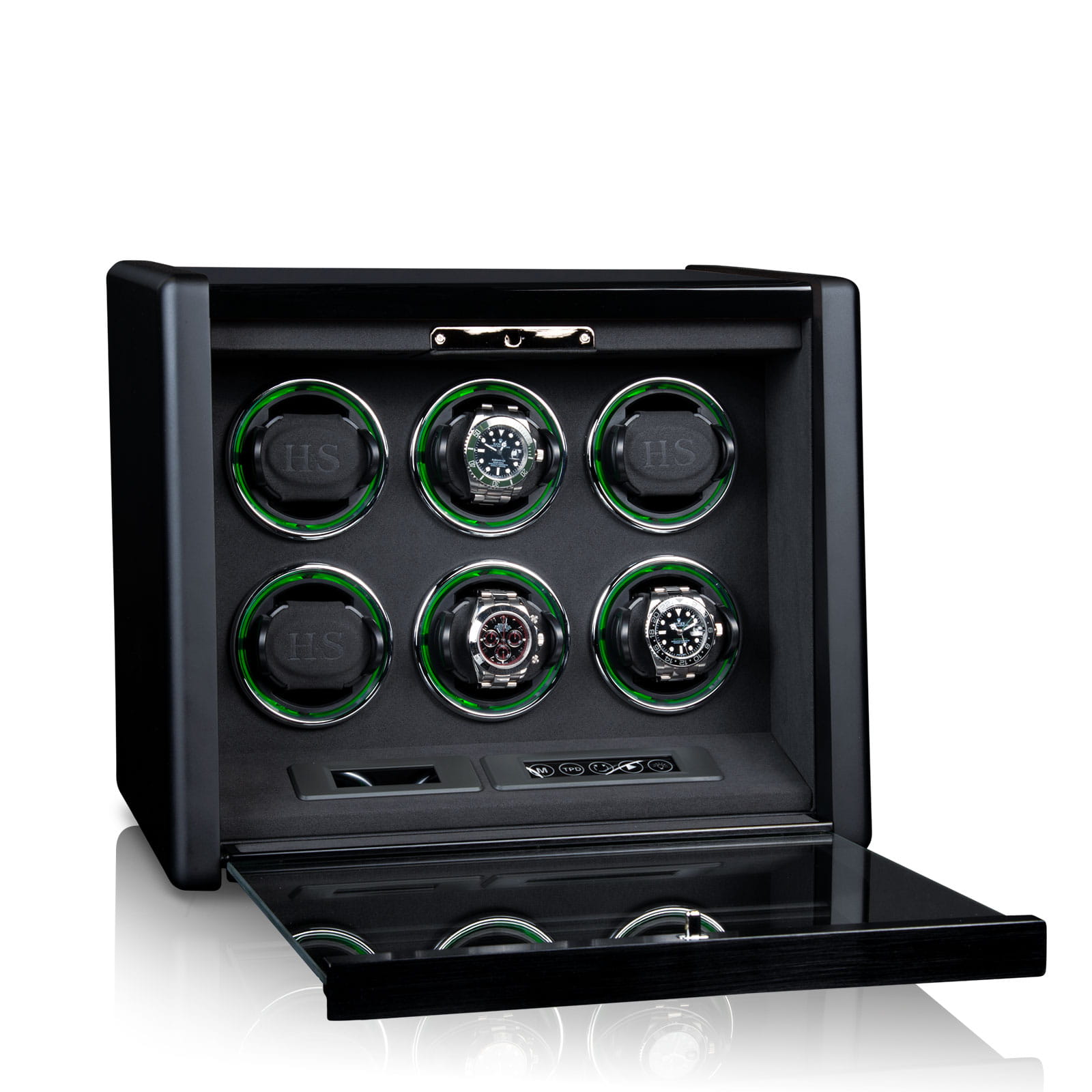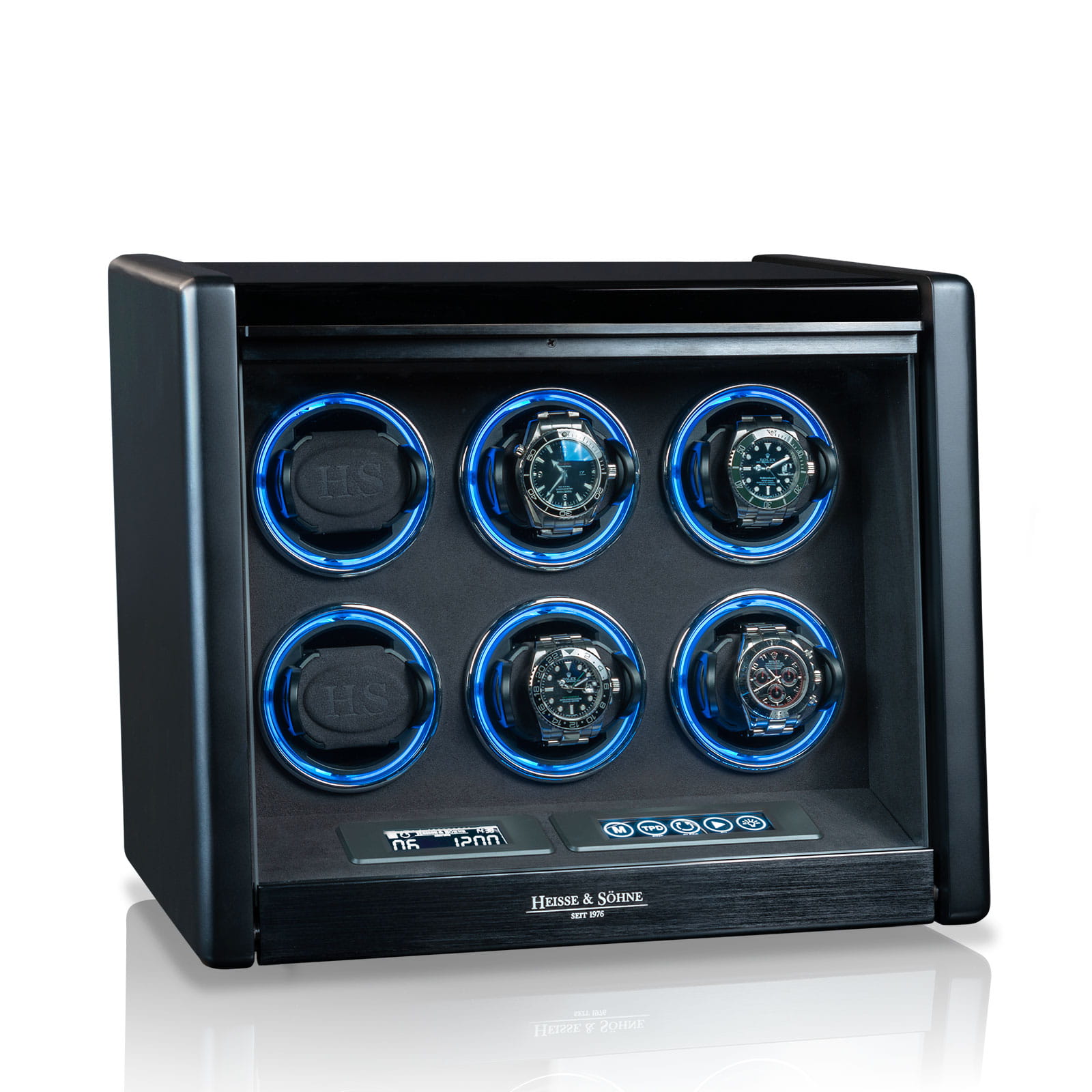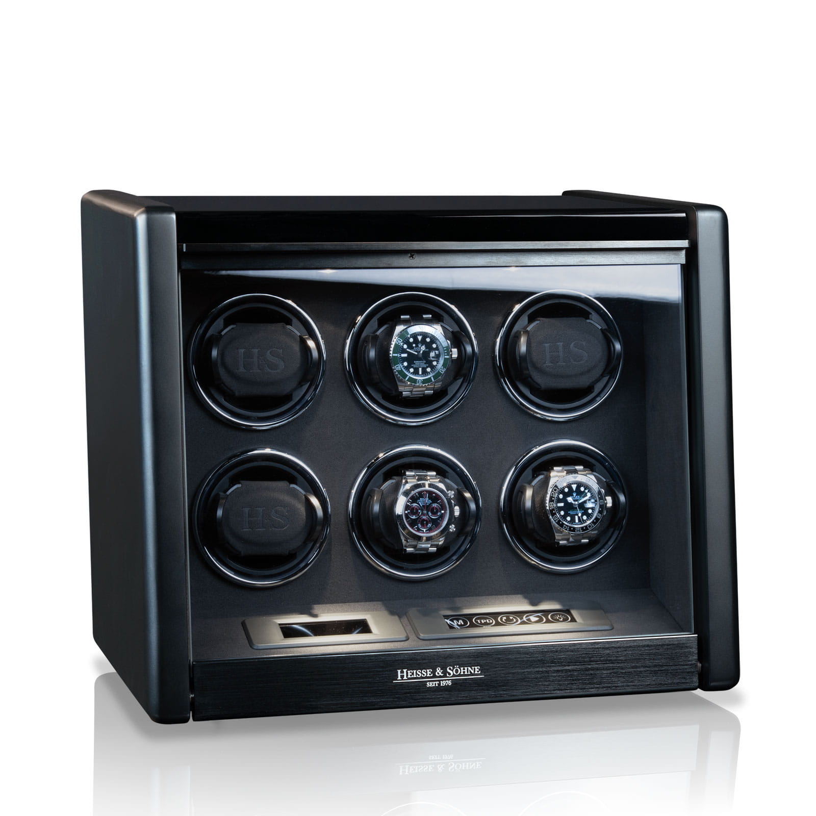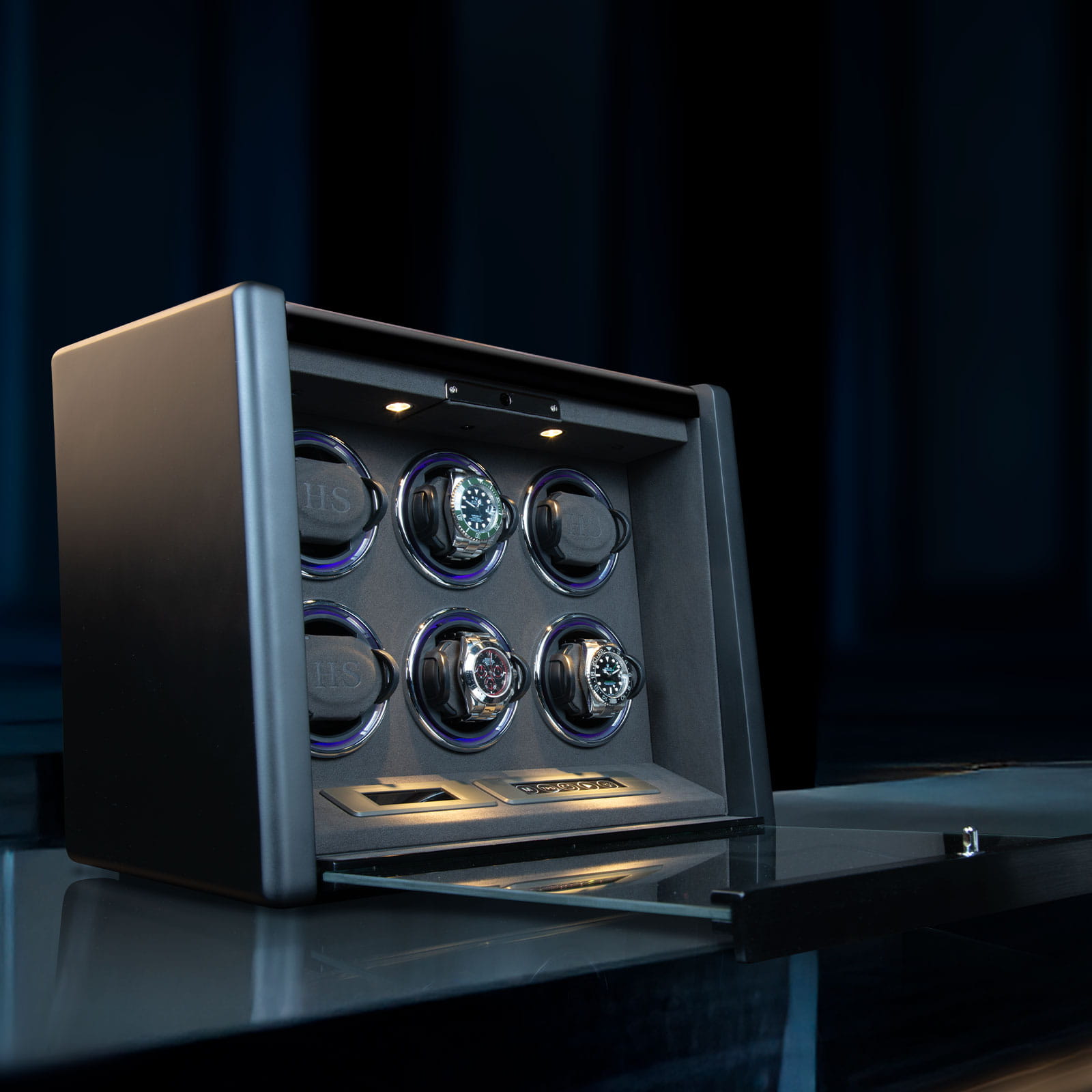 Niezwykle efektownym elementem jest system podświetlenia H&S Motion-Light, umożliwiający wybór barwy światła RGB, który w efektowny sposób eksponuje każdy zegarek. Dodatkowe oświetlenie H&S Spotlight, sterowane niezależnie, pozwala na idealną prezentację nawet w całkowitej ciemności.