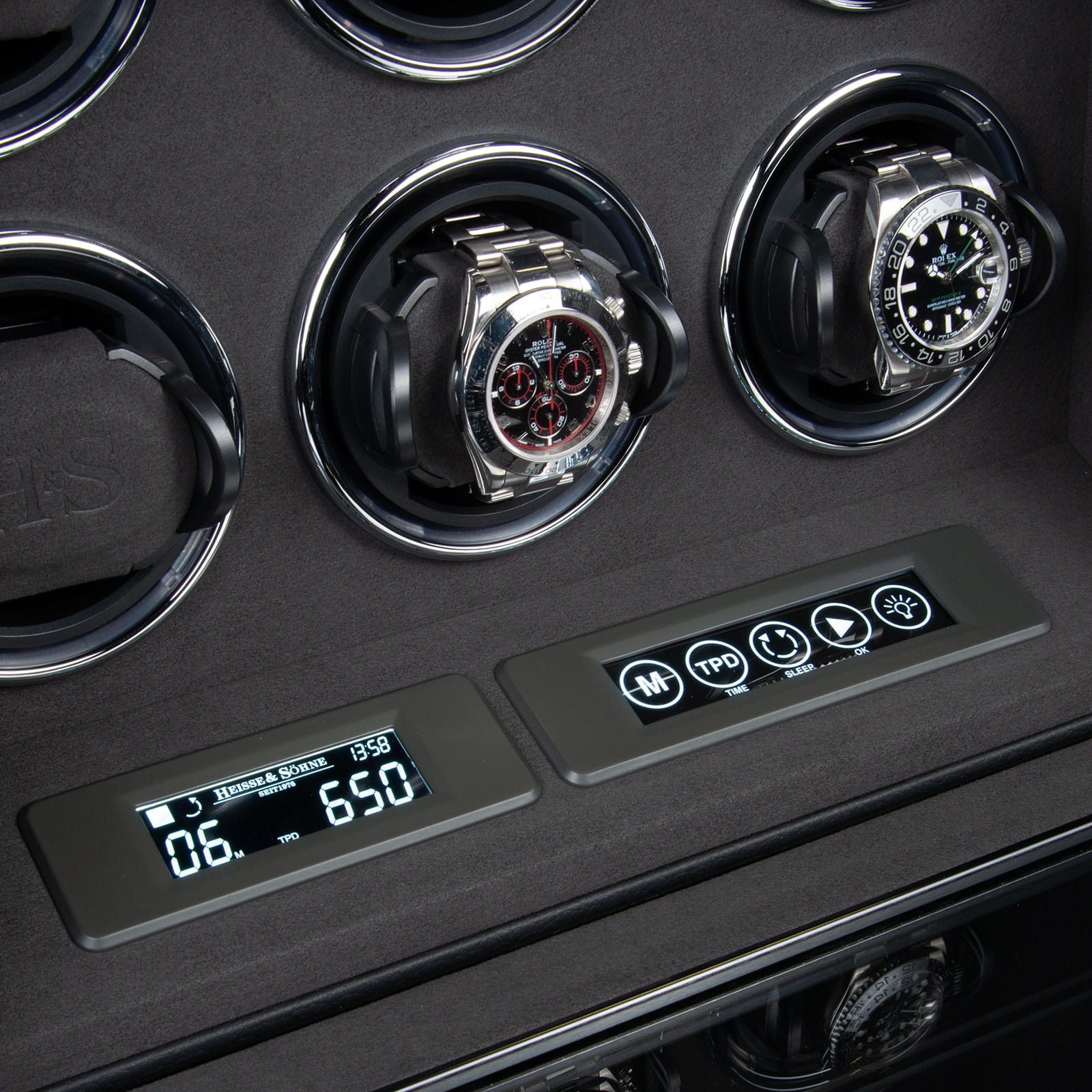 Wewnątrz zastosowano uchwyty H&S High-Flex pokryte miękkim welurem, które delikatnie obejmują zegarki i umożliwiają dopasowanie do nadgarstków o obwodzie od 14 do 22,5 cm. Zatrzaski kulkowe ze stali nierdzewnej gwarantują stabilność i bezpieczeństwo zegarków podczas pracy rotomatu.