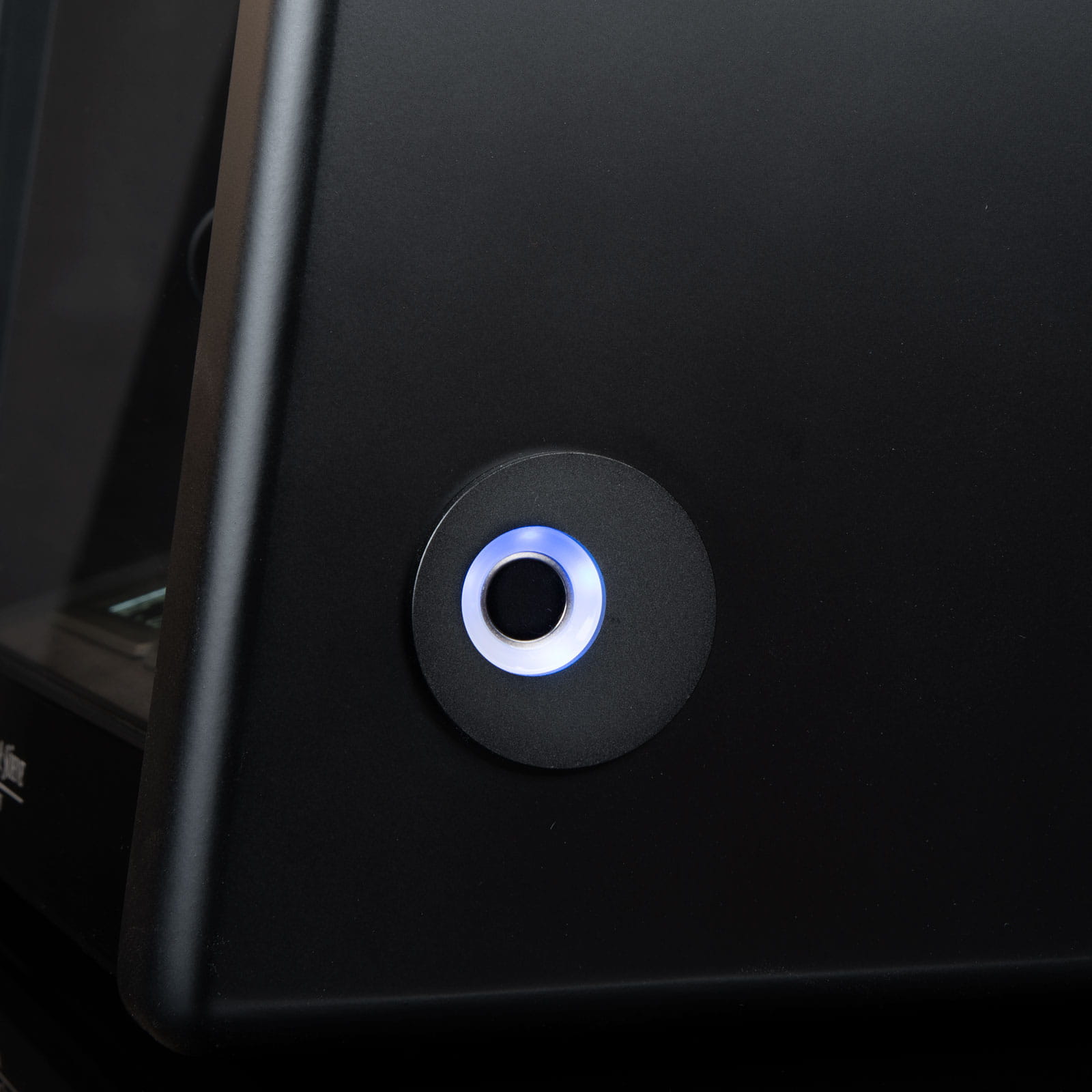 Obudowa o charakterystycznym trapezowym kształcie, wykonana z drewna i MDF-u, przyciąga uwagę swoim nowoczesnym wzornictwem. Wysokopołyskowe lub fornirowane powierzchnie uzupełniono o matowe, czarne boczne panele, które nadają konstrukcji elegancji i stabilności. Przeszklony front z czarnego, anodowanego aluminium otwierany jest ku dołowi, co nadaje całości lekkości i zapewnia pełną ochronę przed kurzem i nieautoryzowanym dostępem. Dostęp do wnętrza możliwy jest dzięki zabezpieczeniu biometrycznemu H&S Fin-Protect – elektronicznemu zamkowi z czytnikiem linii papilarnych.