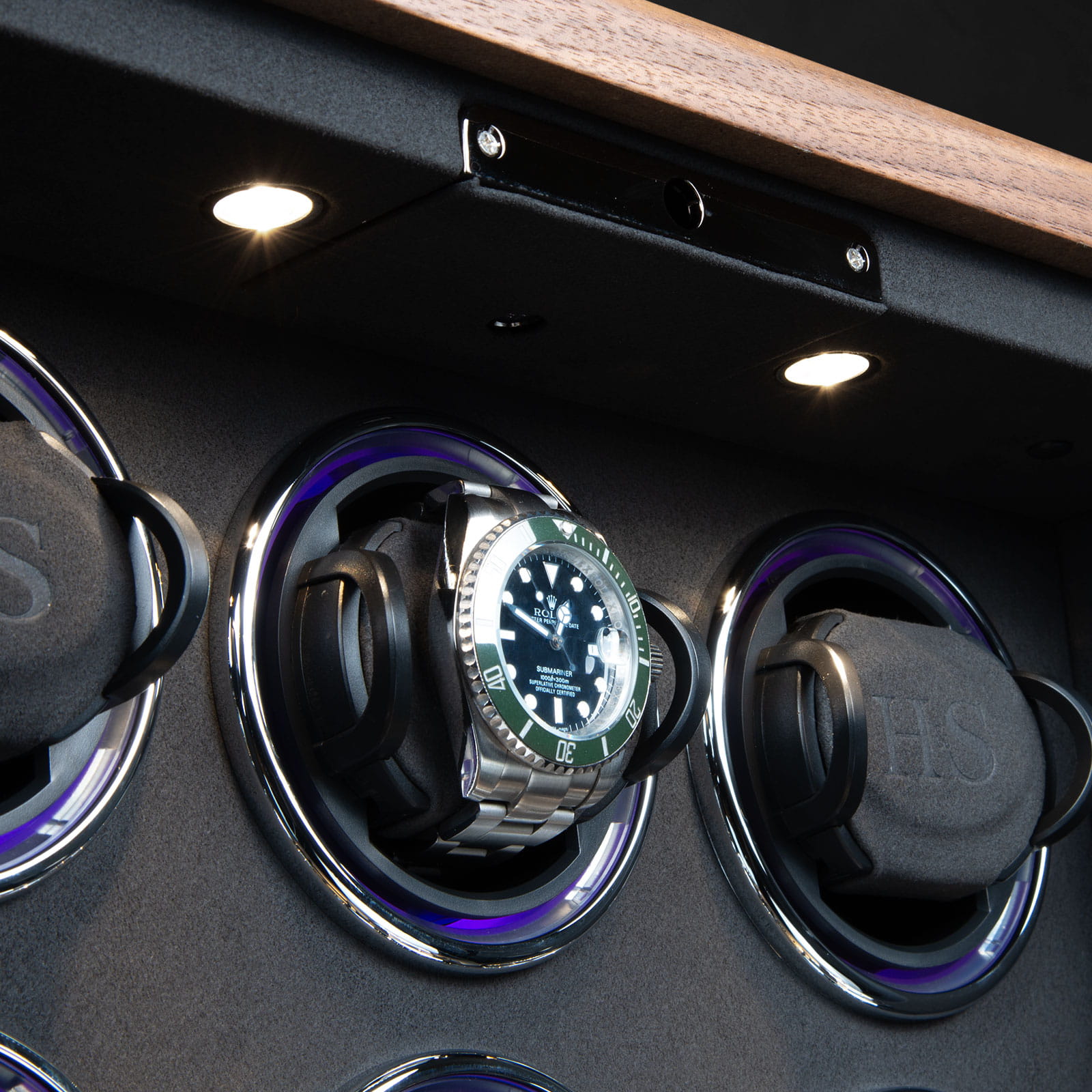 Niezwykle efektownym elementem jest system podświetlenia H&S Motion-Light, umożliwiający wybór barwy światła RGB, który w efektowny sposób eksponuje każdy zegarek. Dodatkowe oświetlenie H&S Spotlight, sterowane niezależnie, pozwala na idealną prezentację nawet w całkowitej ciemności.