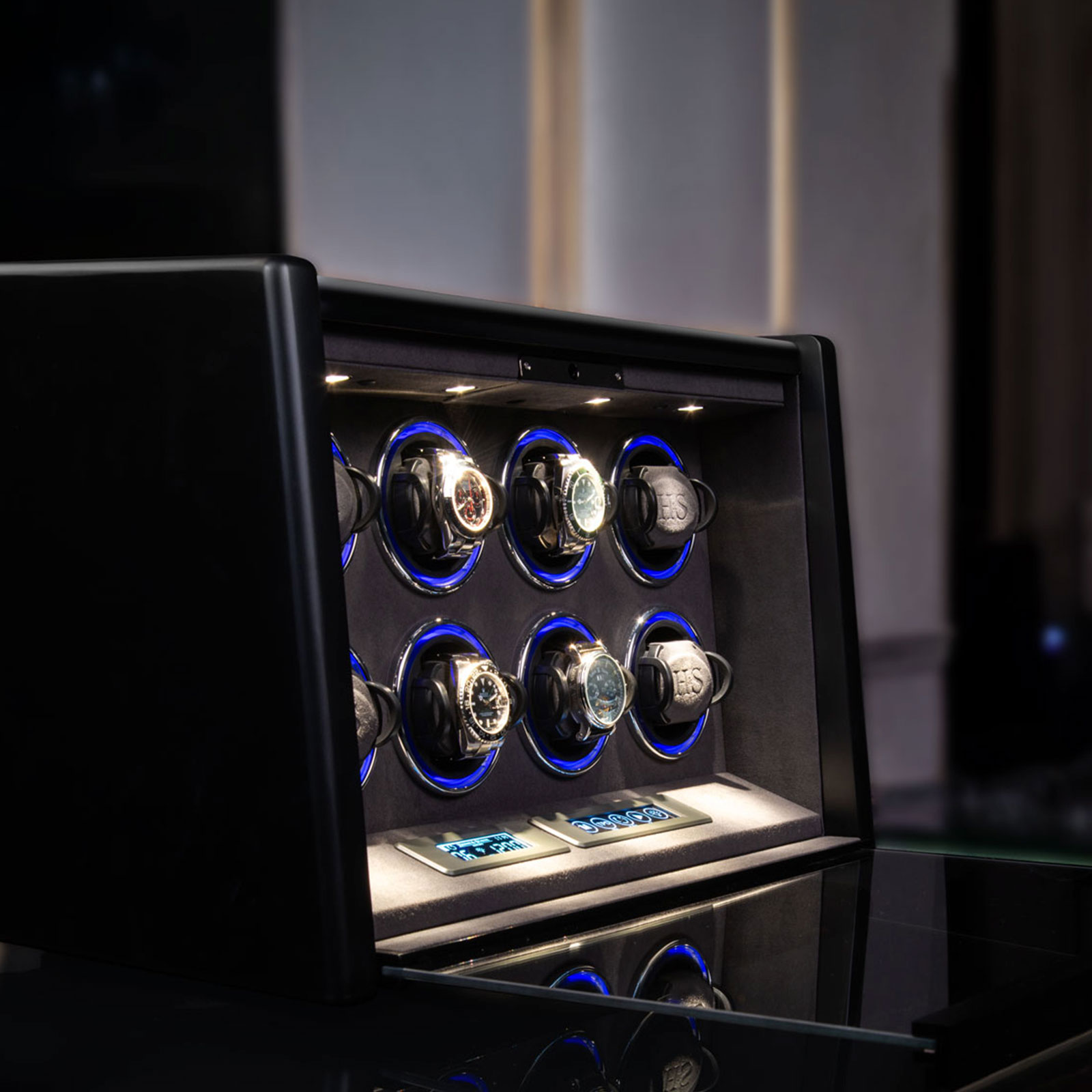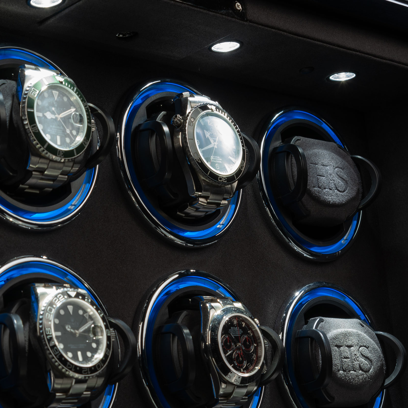 Niezwykle efektownym elementem jest system podświetlenia H&S Motion-Light, umożliwiający wybór barwy światła RGB, który w efektowny sposób eksponuje każdy zegarek. Dodatkowe oświetlenie H&S Spotlight, sterowane niezależnie, pozwala na idealną prezentację nawet w całkowitej ciemności.