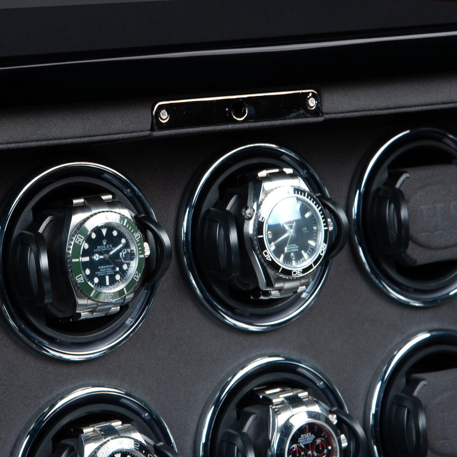 Wewnątrz zastosowano uchwyty H&S High-Flex pokryte miękkim welurem, które delikatnie obejmują zegarki i umożliwiają dopasowanie do nadgarstków o obwodzie od 14 do 22,5 cm. Zatrzaski kulkowe ze stali nierdzewnej gwarantują stabilność i bezpieczeństwo zegarków podczas pracy rotomatu.