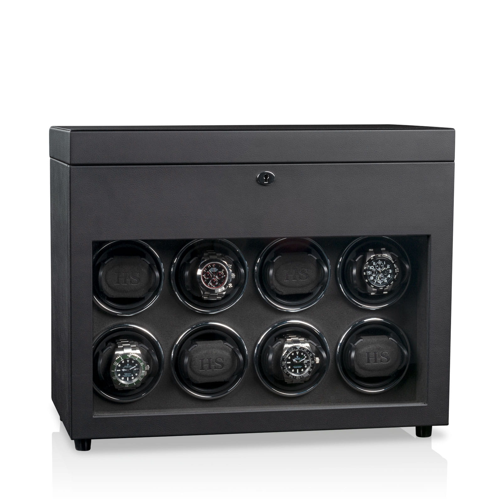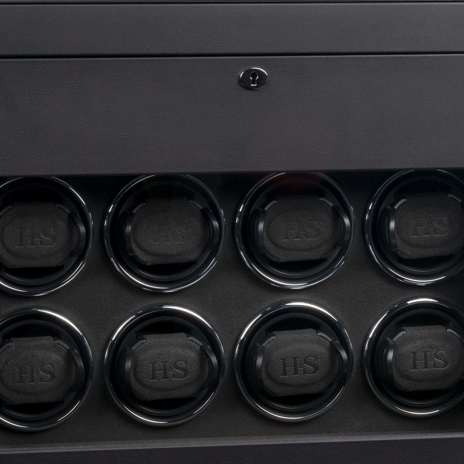 Konstrukcja umożliwia jednoczesne nakręcanie 8 zegarków oraz przechowywanie dodatkowych 6 sztuk w górnej części. Miękkie poduszki z chromowanymi prowadnicami gwarantują stabilność i doskonałą ekspozycję, a zamykane sekcje chronią zawartość przed kurzem i dostępem osób trzecich. Uchwyty H&S High-Flex pokryte miękkim welurem dopasowują się do obwodu zegarków od 14 do 22,5 cm, zapewniając bezpieczne i delikatne mocowanie.
