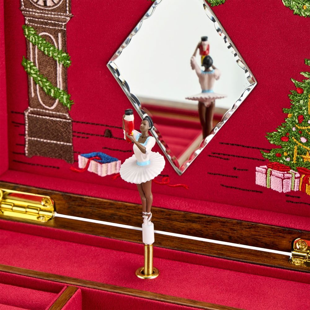 Szkatułka odtwarza melodię „Taniec Wieszczki Cukrowej” z baletu „Dziadek do Orzechów” autorstwa Czajkowskiego – wystarczy nakręcić złoty kluczyk z literą W. Wewnątrz znajdziesz wyściełane opatentowaną tkaniną LusterLoc™ przegródki na biżuterię, pięć wałków na pierścionki oraz ukryty schowek. Całość dopełnia ozdobne lustro w kształcie rombu oraz ręcznie malowane, wymienne figurki baletnic w dwóch odcieniach skóry – idealne, by celebrować różnorodność.