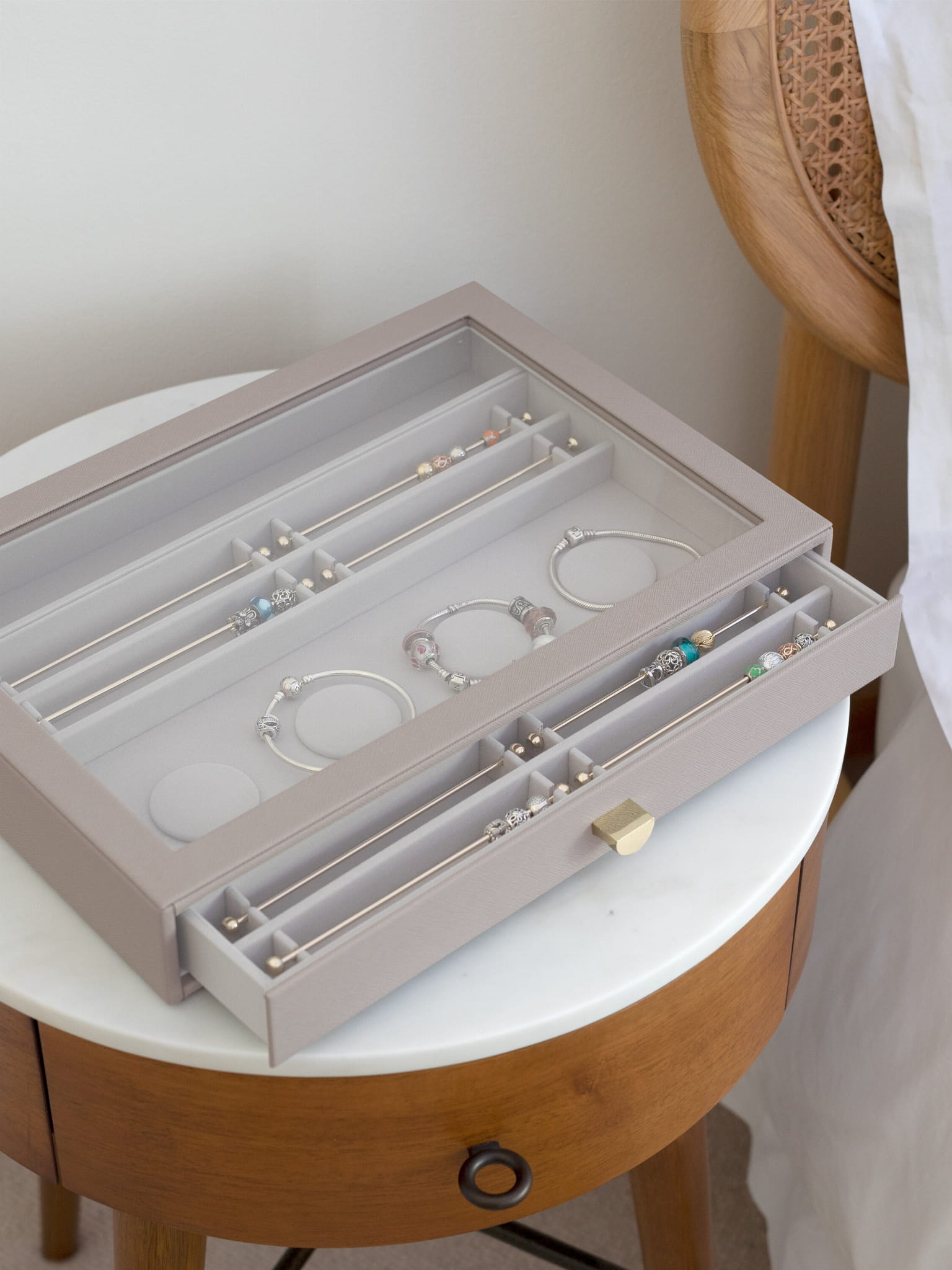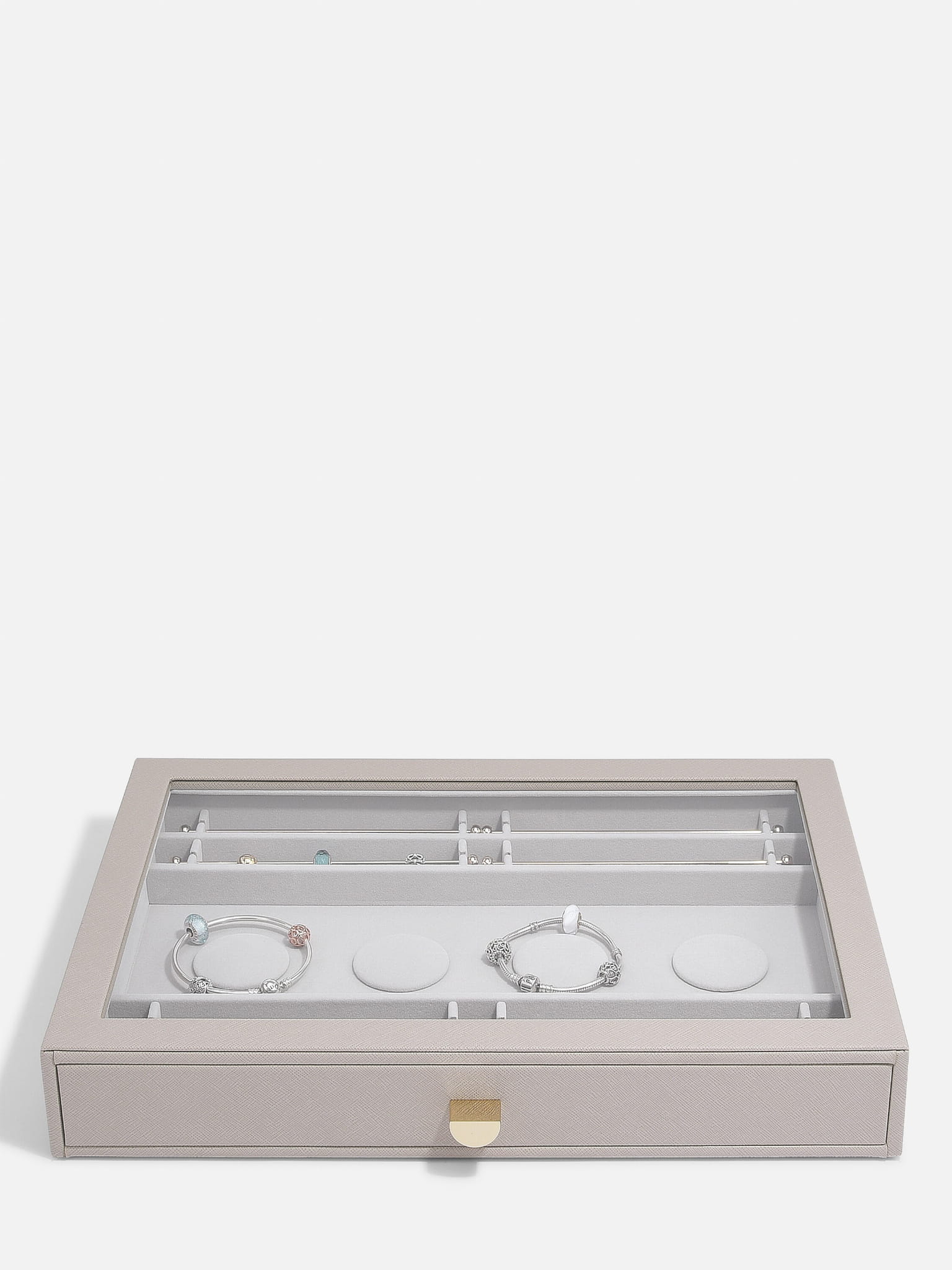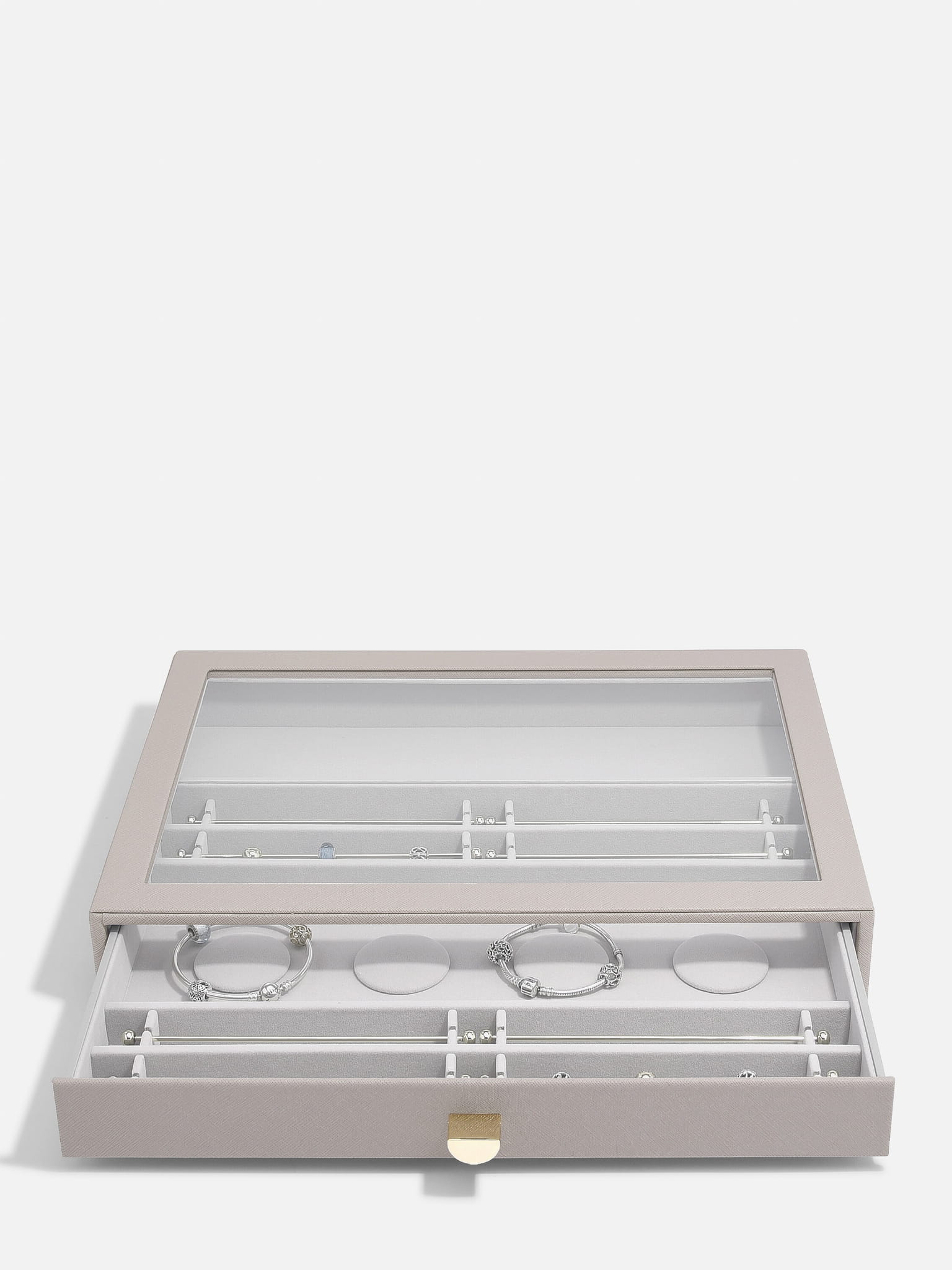 Szuflada ekspozycyjna na bransoletki Supersize to idealna warstwa szuflad na Twoją kolekcję bransoletek, a także inną ulubioną biżuterię. Posiada szklaną pokrywę, dzięki czemu idealnie nadaje się do stworzenia pięknej ekspozycji swojej kolekcji.