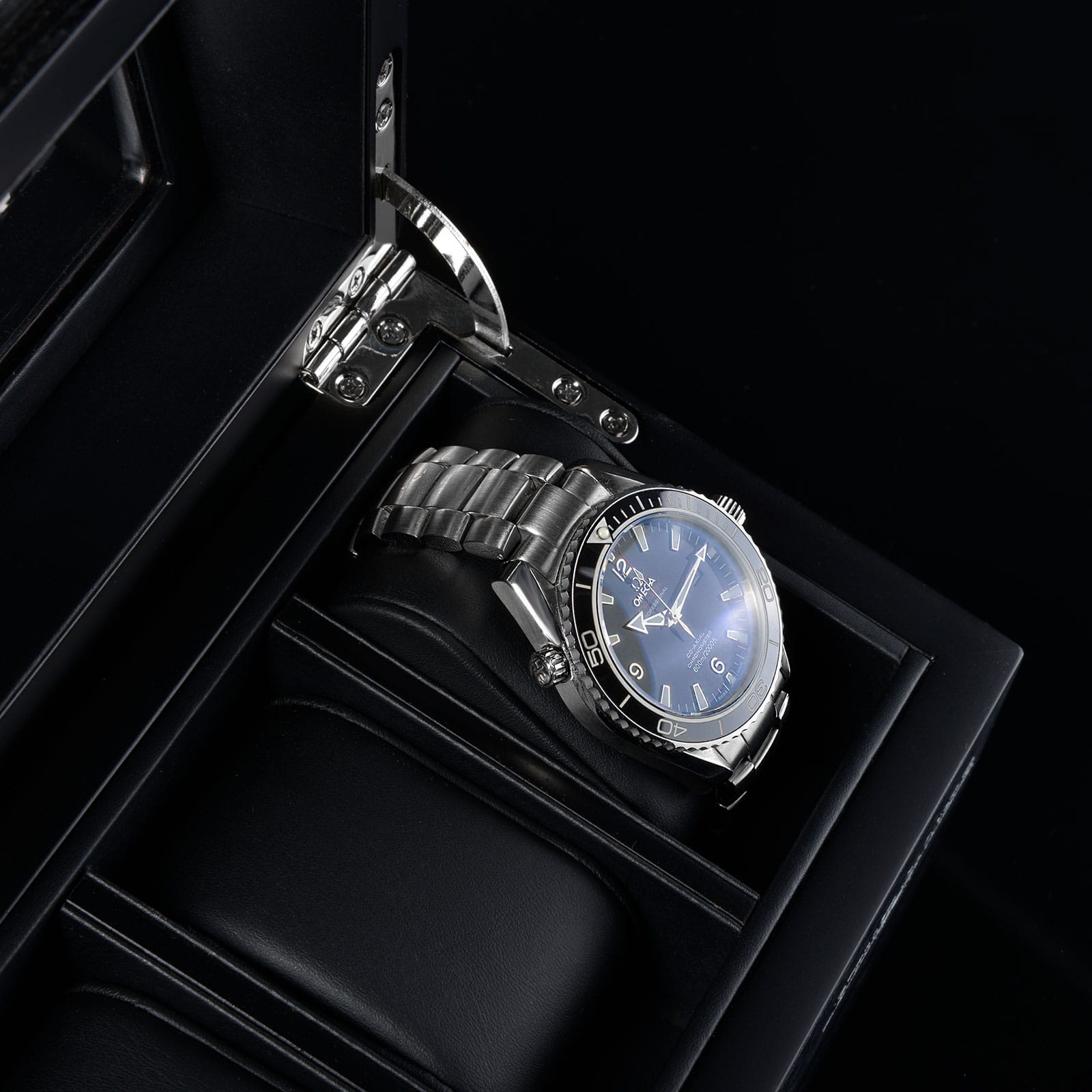 Duże przezroczyste okienko stanowi idealną scenę do prezentacji kolekcji, chroniąc zegarki przed kurzem i uszkodzeniami. Wnętrze wyłożone miękkim welurem oraz poduszki o szerokości 50 mm gwarantują delikatne i stabilne ułożenie zegarków różnych rozmiarów.