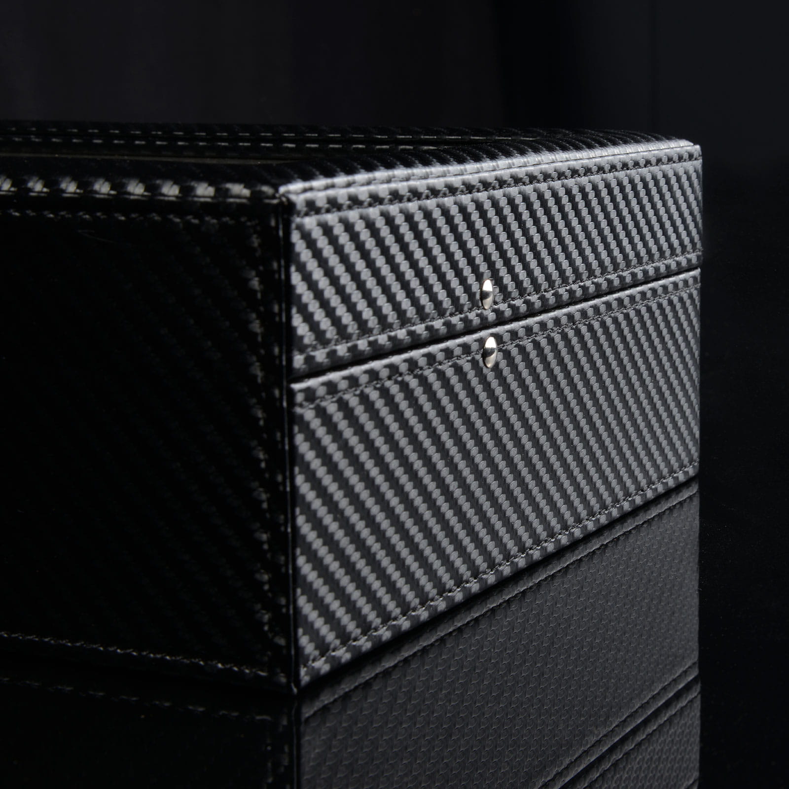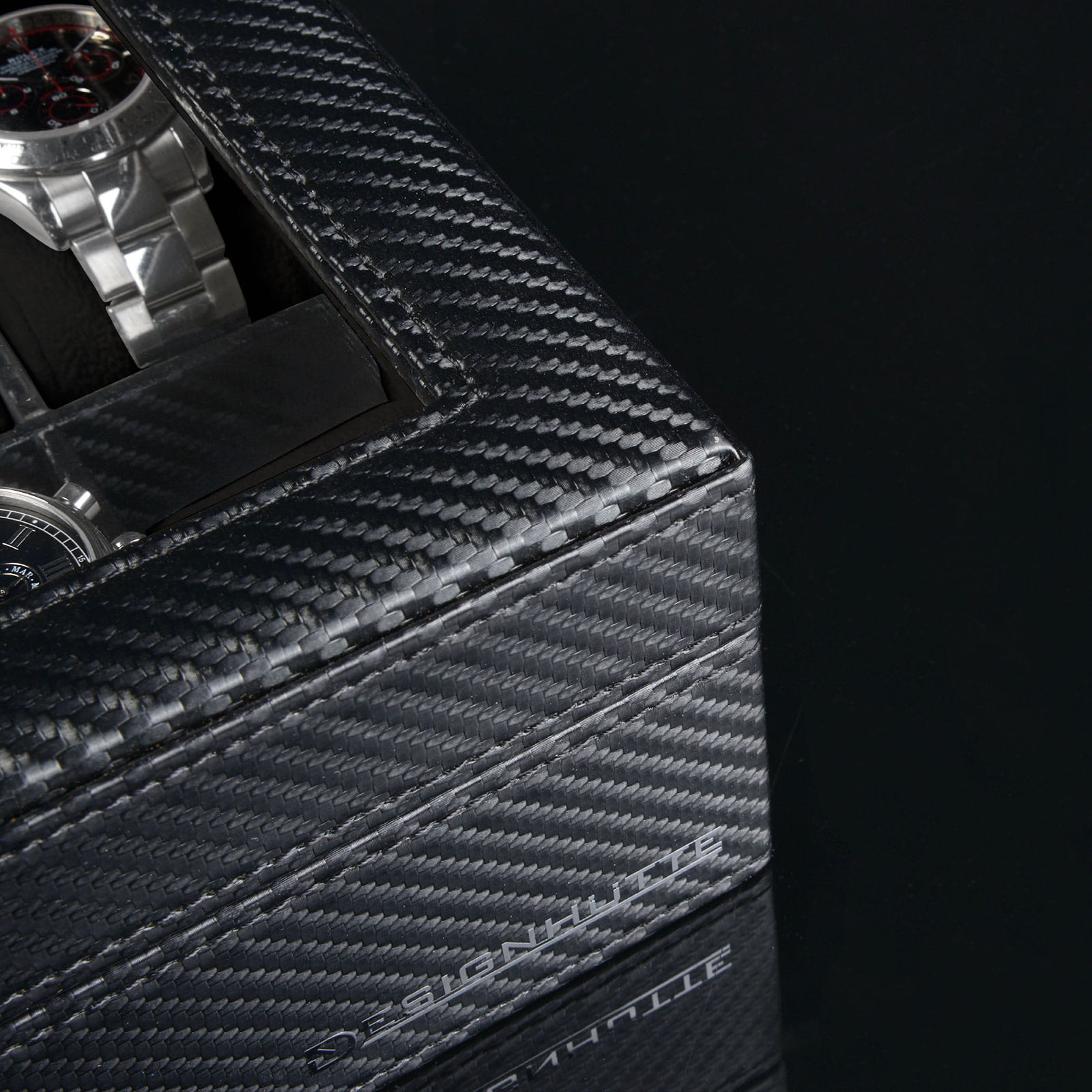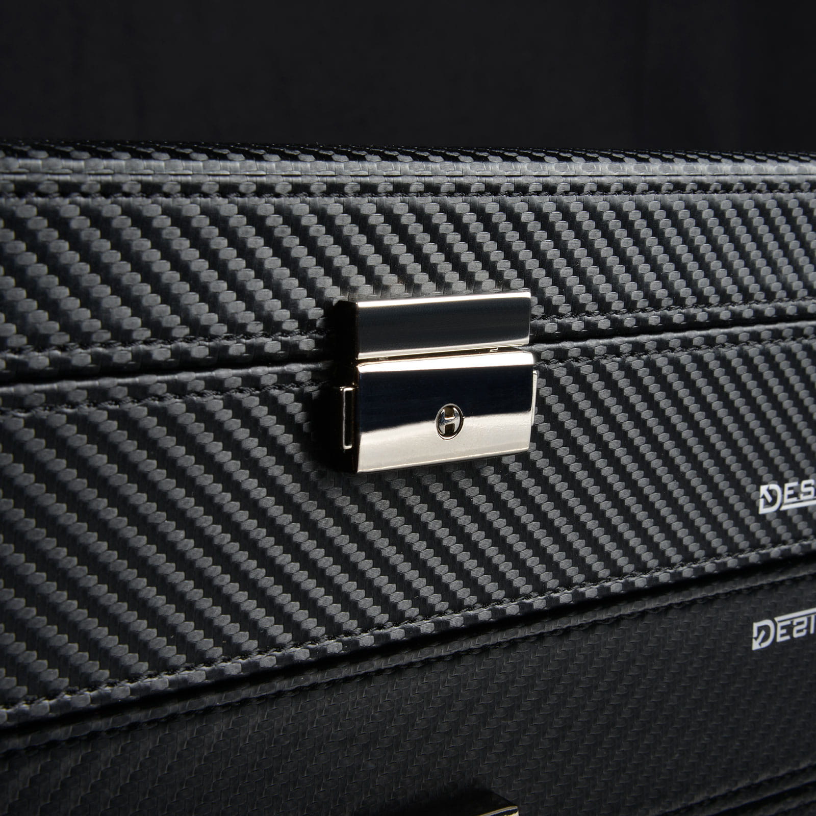 Pudełko Boston 12 zostało wykonane z wysokiej jakości materiałów, w tym szkła mineralnego, które zapewnia trwałość i estetyczny wygląd. Jego powierzchnia w stylu węgla z kontrastującą czernią prezentuje się elegancko i nowocześnie, doskonale pasując do każdego wnętrza. Mineralne szkło chroni zegarki przed kurzem, zarysowaniami i innymi uszkodzeniami.